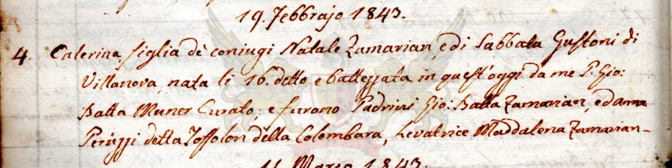 Caterina, filha dos cônjuges Natale Zamarian, e de Sabbata Gustoni de Villanova, nascida dia 16 dito e Batizada neste dia de hoje por mim Padre Giovanni Battista Muner Curador; e foram Padrinhos Giovanni Battista Zamarian, e Anna Peruzzi dita Zoffolon de Colombara, Parteira Maddalena Zamarian.