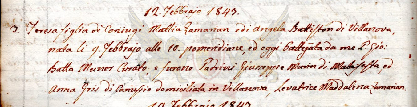 Teresa filha dos cônjuges Mattia Zamarian, e de Angela Battiston de Villanova, nascida dia 9 de Fevereiro às 10 horas pos meridiana, e hoje Batizada por mim Padre Giovanni Battista Muner Curador; e foram Padrinhos Giuseppe Marin de Malafesta e Anna Gris de Canussio domiciliada em Villanova, Parteira Maddalena Zamarian.