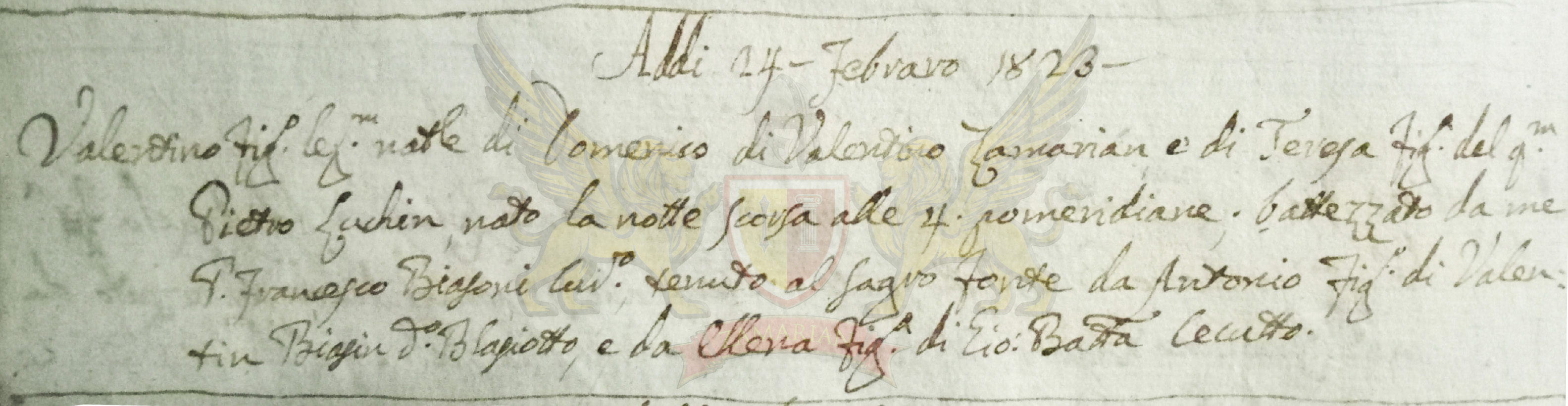 Valentino filho legítimo nascido de Domenico filho de Valentino Zamarian e de Teresa filha do finado Pietro Luchin, nascido na noite passada às quatro pós meridiano batizado por mim D. Francesco Biasoni Curador levado à Sacra Fonte por Antonio filho de Valentin Biasin conhecido por Blaziotto, e por Ellena Filha de Giovanni Battista Cecutto.