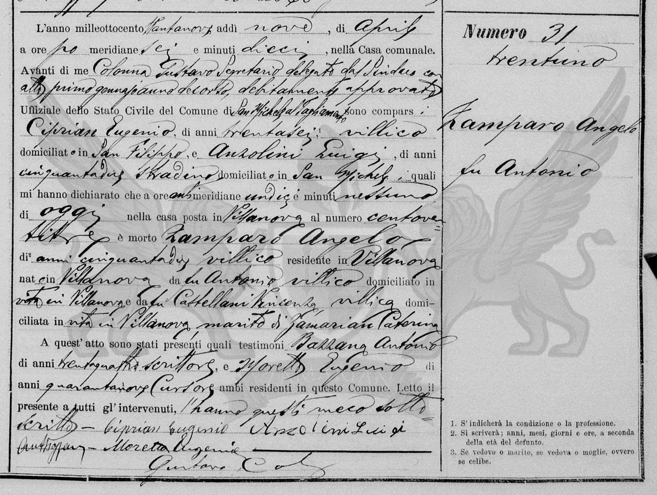 Diante de mim Colonna Gustavo, Secretário delegado do Síndico com ato primeiro de janeiro do ano decorrido, devidamente aprovado, Oficial do Registro Civil do Município de San Michele al Tagliamento, compareceram Ciprian Eugenio, de trinta e seis anos, camponês, domiciliado em San Filippo, e Anzolin Luigi, de cinquenta e dois anos, pavimentador, domiciliado em San Michele, os quais me declararam que às ante meridiana onze horas, de hoje, na casa situada em Villanova ao número cento e vinte e três, faleceu Zamparo Angelo, de cinquenta e dois anos, camponês, residente em Villanova, nascido em Villanova, (filho) do falecido Antonio, camponês, domiciliado em vida em Villanova e da falecida Castellani Vincenza, camponesa, domiciliada em vida em Villanova, marido de Zamarian Caterina.