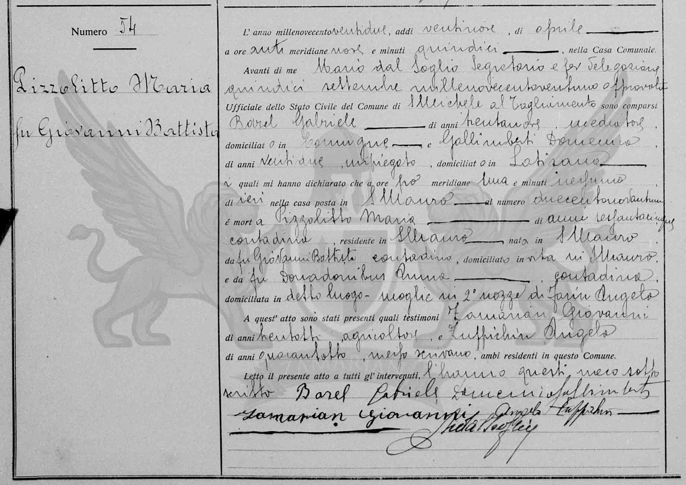 Diante de mim Mario dal Soglio, Secretário delegado pelo Síndico com ato quinze de setembro de mil novecentos e um, aprovado Oficial do Estado Civil do Município de San Michele al Tagliamento, compareceram Barel Gabriele, de trinta e dois anos, mediador, domiciliado em Comugne, e Gallimberti Domenico, de vinte e dois anos, atendente, domiciliado em Latisana, os quais me declararam que às pós meridiana uma hora, de ontem, na casa situada em San Mauro, ao número duzentos e noventa e um, faleceu Pizzolitto Maria de sessenta e cinco anos, camponesa, residente em San Mauro, nascida San Mauro, (filha) do falecido Giovanni Battista, camponês domiciliado em vida em San Mauro, e da falecida Donadonibus Anna, camponesa, domiciliada em vida no referido local, viúva em 2ª núpcias de Farin Angelo.