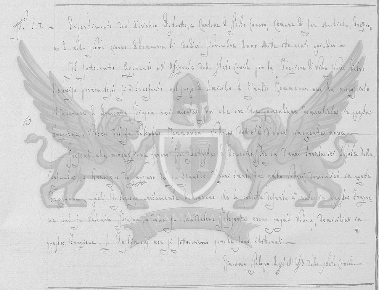 Departamento do Adriático, Distrito e Cantão de Porto Gruaro, Município de San Michele, Fração de Villa Nova dia de domingo, doze de novembro do ano mil oitocentos e quinze.