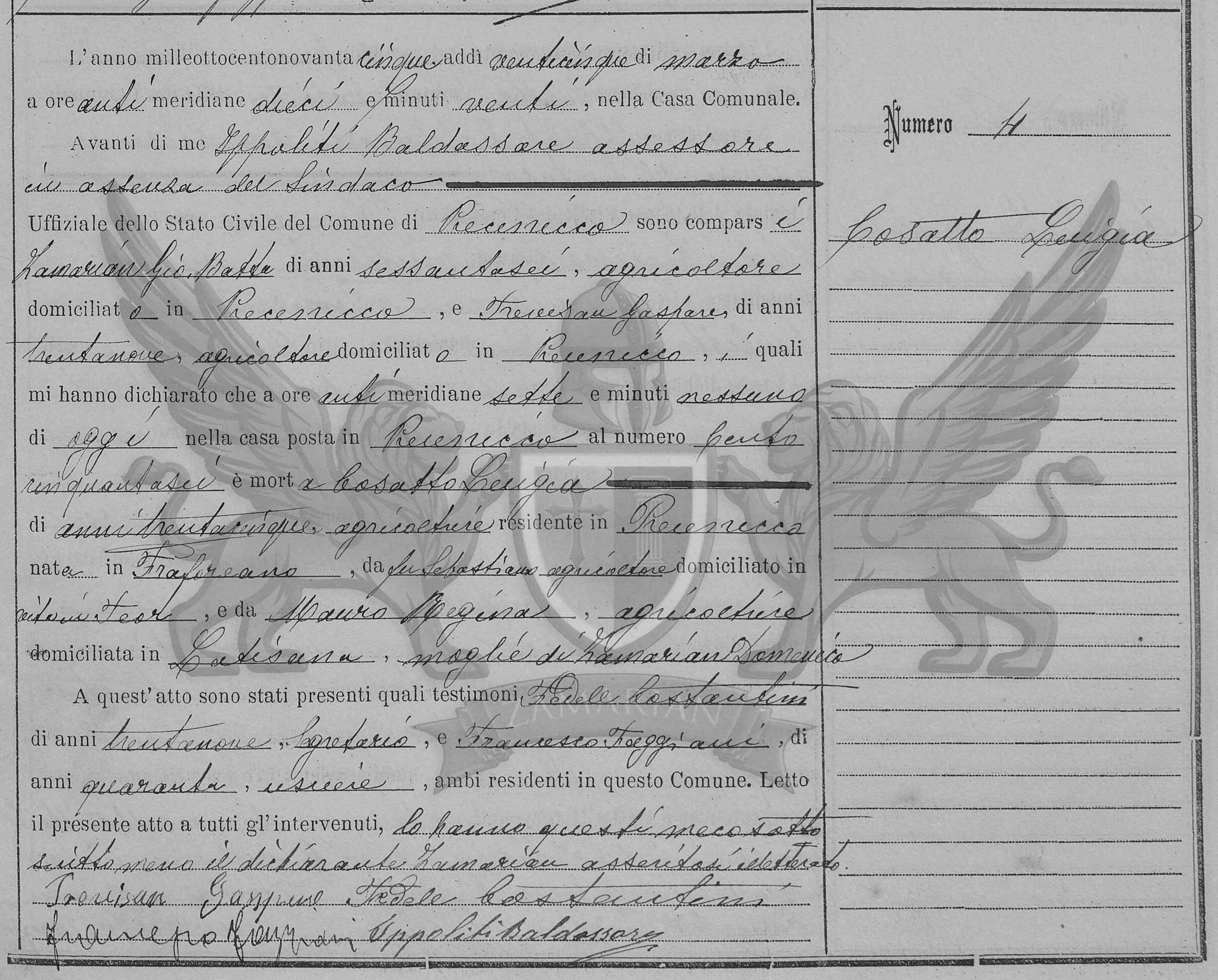Diante de mim Ippoliti Baldassare assessor em ausência do Síndico Oficial do Registro Civil do Município de Precenicco, compareceram Zamarian Gio Batta, de sessenta e seis anos, agricultor, domiciliado em Precenicco, e Trevisan Gaspare, de trinta e nove anos, agricultor, domiciliado em Precenicco, os quais me declararam que às sete horas da manhã, de hoje, na casa situada em Precenicco, ao número cento e cinquenta e seis, faleceu Cosatto Luigia, de trinta e cinco anos, agricultora, residente em Precenicco, nascida em Fraforeano, filha do finado Sebastiano, agricultor, domiciliado em vida em Teor, e de Mauro Regina, agricultora, domiciliada Latisana, mulher de Zamarian Domenico.