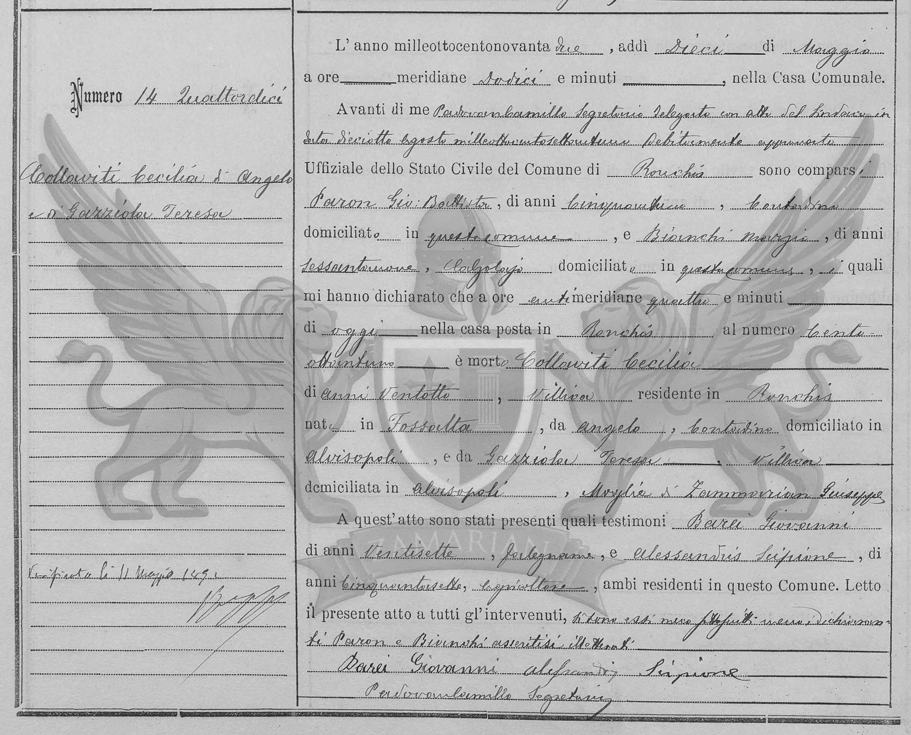 Diante de mim Padovan Camillo secretário delegado com ato do Síndico em data dezoito de agosto de mil oitocentos e noventa e dois, devidamente aprovado Oficial do Estado Civil do Município de Ronchis, compareceram Paro Giovanni Battista, de cinquenta e um anos, camponês, domiciliado neste município, e Bianchi Marzio, de sessenta e nove anos, sapateiro, domiciliado neste município, os quais me declararam que às anti meridianas quatro horas de hoje, na casa situada em Ronchis, ao número cento e oitenta e um, faleceu Colloviti Cecilia de vinte e oito anos, camponesa, domiciliada em Alvisopoli nascida em Fossalta, filha de Angelo, camponês, domiciliado em Alvisopoli, e de Gazziola Teresa, camponesa, domiciliada em Alvispoli, mulher de Zammarian Giuseppe