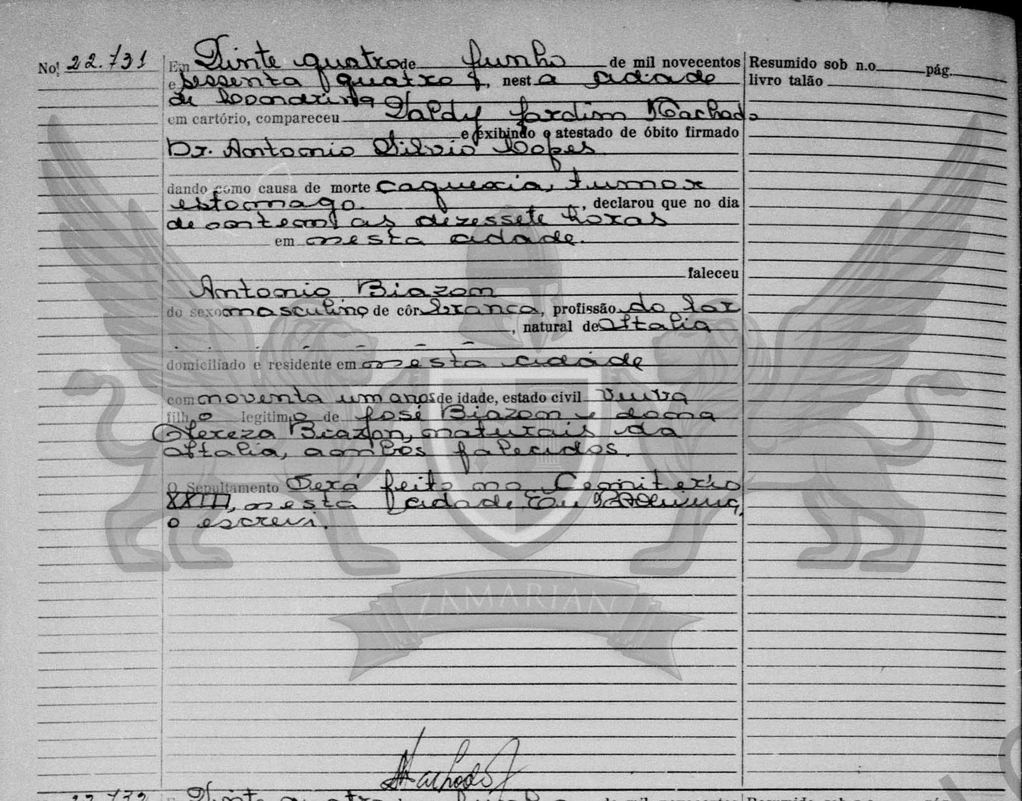 Em vinte e quatro de junho de mil novecentos e sessenta e quatro, nesta cidade de Londrina, em cartório, compareceu Valdir Jardim Machado, e exibindo o atestado de óbito firmado Dr. Antonio Silvio Lopes dando como causa de morte caquexia, tumor estômago, declarou que no dia de ontem às dezessete horas, nesta cidade faleceu Antonio Biazon do sexo masculino, de côr branca, profissão do lar, natural de Itália domiciliado e residente neste distrito com noventa e um anos de idade, estado civil viúva, filho legítimo de José Biazon e dona Tereza Biazon, naturais da Italia, ambos falecidos. O sepultamento será feito no cemitério XXIII, nesta Cidade. Eu M Oliveira o escrevi.