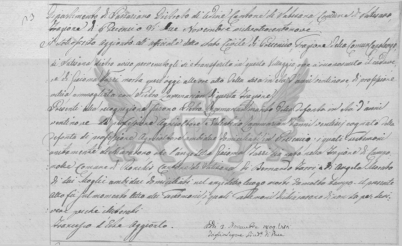Departamento de Passariano, Distrito de Udine, Cantão de Latisana, Município de Latisana, Fração de Precenicco dia dois de novembro de 1809.