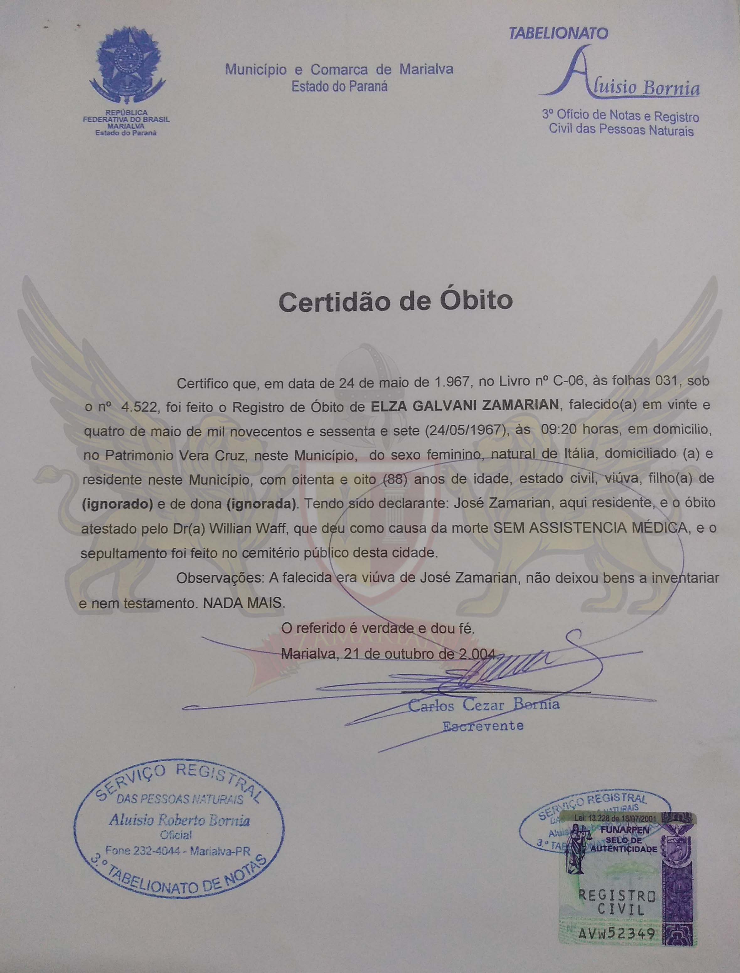 Certifico que, em data de 24 de maio de 1.967, no Livro nº C-06, às folhas 031, sob o nº 4.522, foi feito o registro de óbito de ELZA GALVANI ZAMARIAN, falecida em vinte e quatro de maio de mil novecentos e sessenta e sete (24/05/1967), às 09:20 horas, em domicilio, no patrimônio de Vera Cruz, neste município, do sexo feminino, natural da Itália, domiciliado e residente neste Município, com oitenta e oito (88) anos de idade, estado civil, viúva, filha de (ignorado) e de dona (ignorada). Tendo sido declarante: José Zamarian, aqui residente, e o óbito atestado pelo Dr. Willian Waff, que deu como causa da morte SEM ASSISTÊNCIA MÉDICA, e o sepultamento foi feito no cemitério público desta cidade.