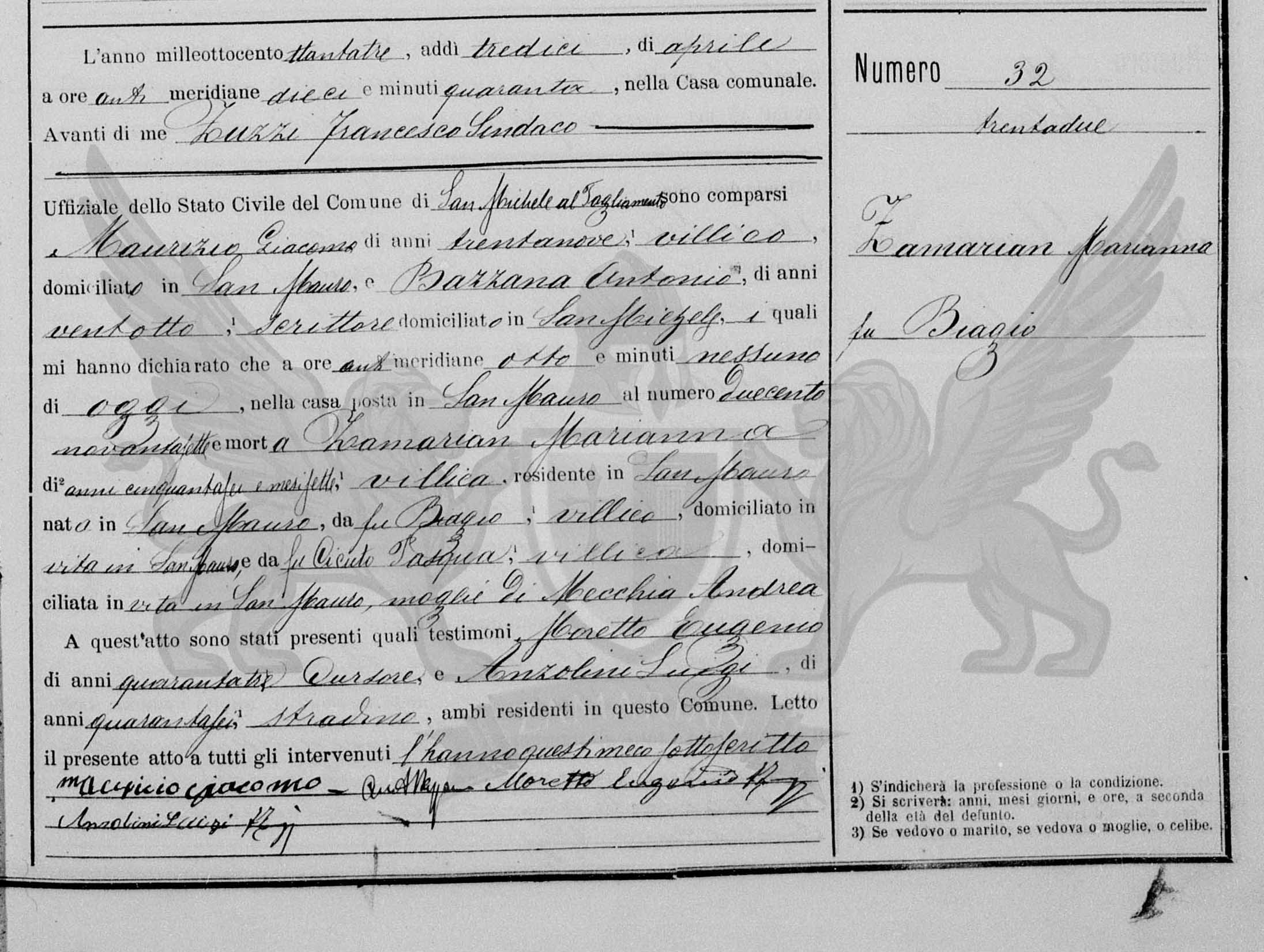 Diante de mim Zuzzi Francesco Síndico Oficial do Registro Civil do Município de San Michele al Tagliamento, compareceram Maurizio Giacomo, de trinta e nove anos, camponês, domiciliado em San Mauro, e Bazzana Antonio, de vinte e oito anos, escrevente, domiciliado in San Michele, os quais me declararam que às ante meridiana oito horas, de hoje, na casa situada em San Mauro ao número duzentos e noventa e sete, faleceu Zamarian Marianna, de cinquenta e seis anos, camponesa, residente em San Mauro, nascida em San Mauro, (filha) do falecido Biagio, camponês, domiciliado em vida e em San Mauro e da falecida Cicuto Pasqua, camponesa, domiciliada em vida em San Mauro, esposa de Mecchia Andrea.