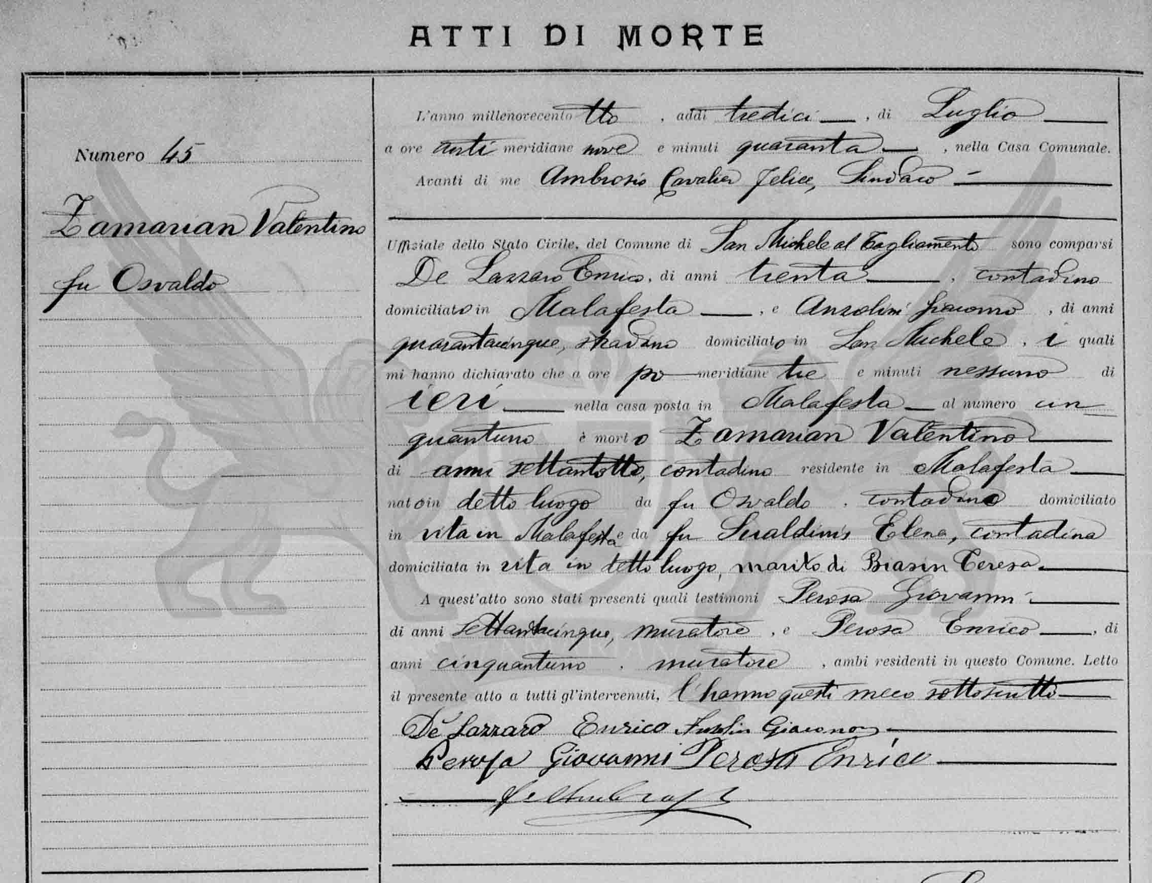 Diante de mim Ambrosio Felice Síndico Oficial do Estado Civil do Município de San Michele al Tagliamento, compareceram De Lazaro Enrico, de trinta anos, camponês, domiciliado em Malafesta, e Anzolini Giacomo, de quarenta e cinco anos, pavimentador, domiciliado em San Michele, os quais me declararam que às pós meridiana três horas, de ontem, na casa situada em Malafesta, ao número cinquenta e um, faleceu Zamarian Valentino, de setenta e oito anos, camponês, residente em Malafesta, nascido no referido local, (filho) do falecido Osvaldo, camponês, domiciliado em vida em Malafesta, e da falecida Osvaldinis Elena, camponesa, domiciliada em vida no referido local, marido de Biasin Teresa.