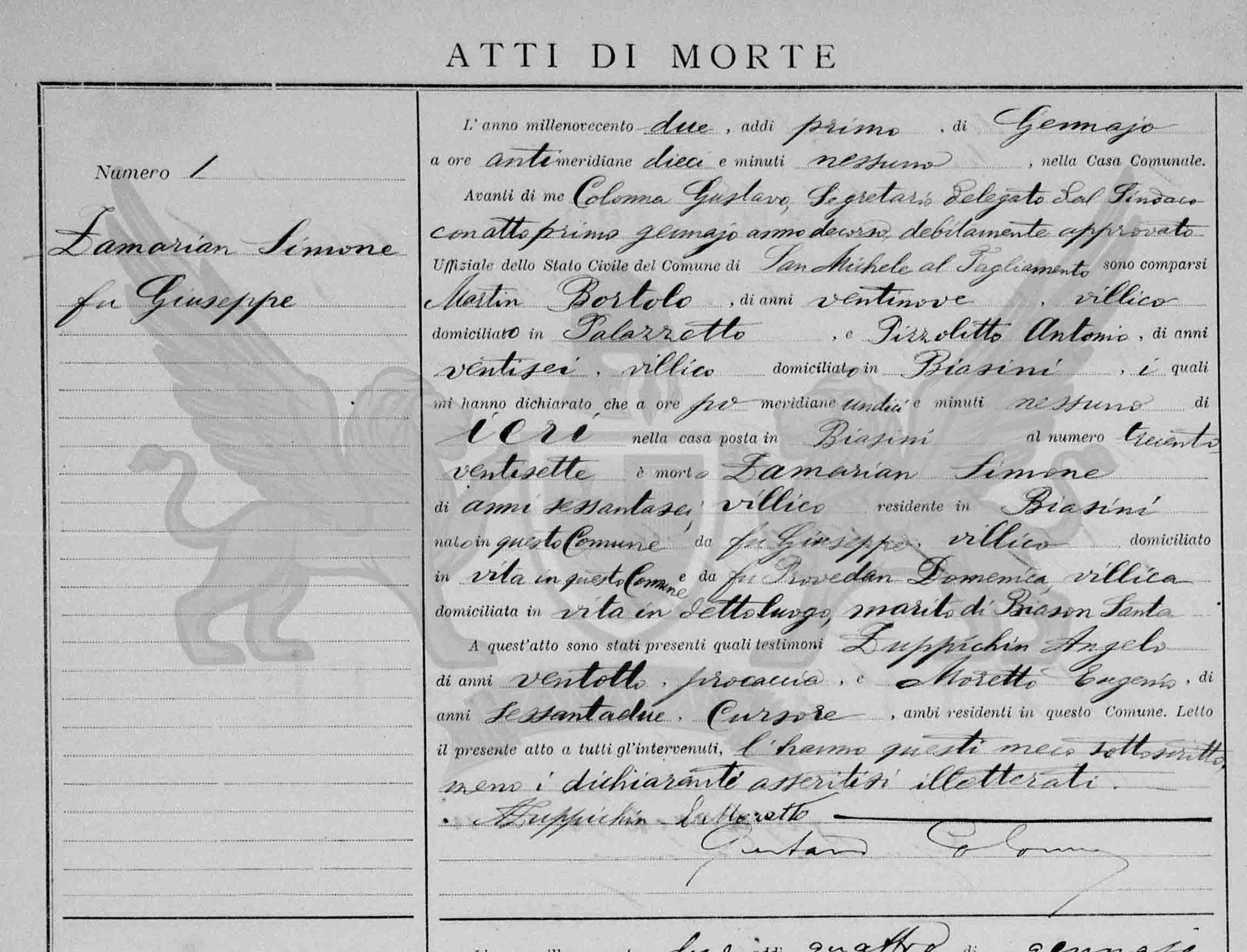 Diante de mim Colonna Gustavo, Secretário delegado do Síndico com ato primeiro de janeiro do ano corrente devidamente aprovado Oficial do Estado Civil do Município de San Michele al Tagliamento, compareceram Martin Bortolo, de vinte e nove anos, camponês, domiciliado em Palazzetto, e Pizzolitto Antonio, de vinte e seis anos, camponês, domiciliado em Biasini, os quais me declararam que às pós meridiana onze horas, de ontem, na casa situada em Biasini, ao número trezentos e vinte e sete, faleceu Zamarian Simone, de sessenta e seis anos, camponês, residente em Biasini, nascido neste município, (filho) do falecido Giuseppe, camponês, domiciliado em vida neste Município, e da falecida Brovedan Domenica, camponesa, domiciliada em vida no referido local, marido de Biason Santa.