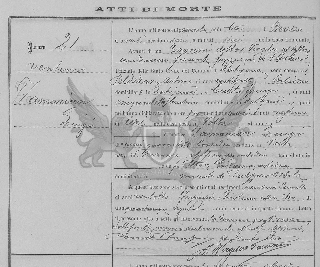 Diante de mim De Lorenzo Giovanni Síndico Oficial do Registro Civil do Município de Precenicco, compareceram Zamarian Giacomo, de cinquenta e três anos, camponês, domiciliado em Precenicco, e Fabris Giorgio, de sessenta e dois anos, carteiro, domiciliado em Precenicco, os quais me declararam que as seis horas da tarde, de ontem na casa situada em Precenicco, ao número cento e vinte faleceu Prospero Orsola de quarenta e um anos, camponesa, residente em Precenicco nascida em Precenicco, filha do finado Domenico, camponês, domiciliado em vida em Precenicco, e da finada Dorizo Santa, camponesa, domiciliada em vida em Precenicco, viúva de Zamarian Luigi.