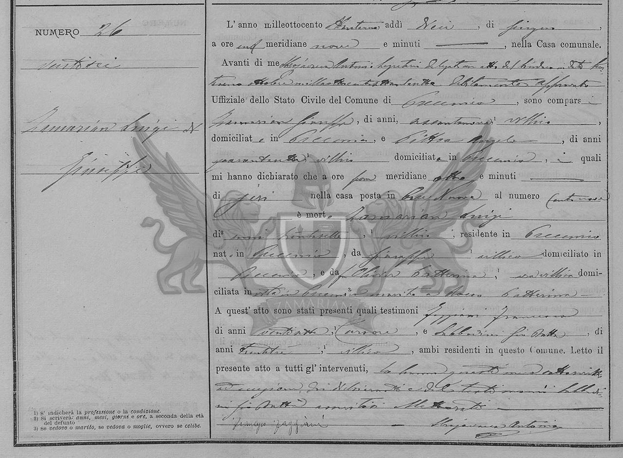 Diante de mim Sbrojavacea Antonio secretário delegado com ato dia trinta e um de outubro de mil oitocentos e setenta e sete devidamente aprovado Oficial do Registro Civil do Município de Precenicco, compareceram Zamarian Giuseppe, de sessenta e nove anos, camponês, domiciliado em Precenicco, e Pitton Angelo, de quarenta e três anos, camponês, domiciliado em Precenicco, os quais me declararam que as oito horas da noite, de ontem na casa situada em Case Nuove, ao número cento e nove faleceu Zamarian Luigi de trinta e sete anos, camponês, residente em Precenicco nascido em Precenicco, filho de Giuseppe, camponês, domiciliado em Precenicco, e da finada Olivier Catterina, era camponesa, domiciliada em Precenicco, marido de Rosso Catterina.