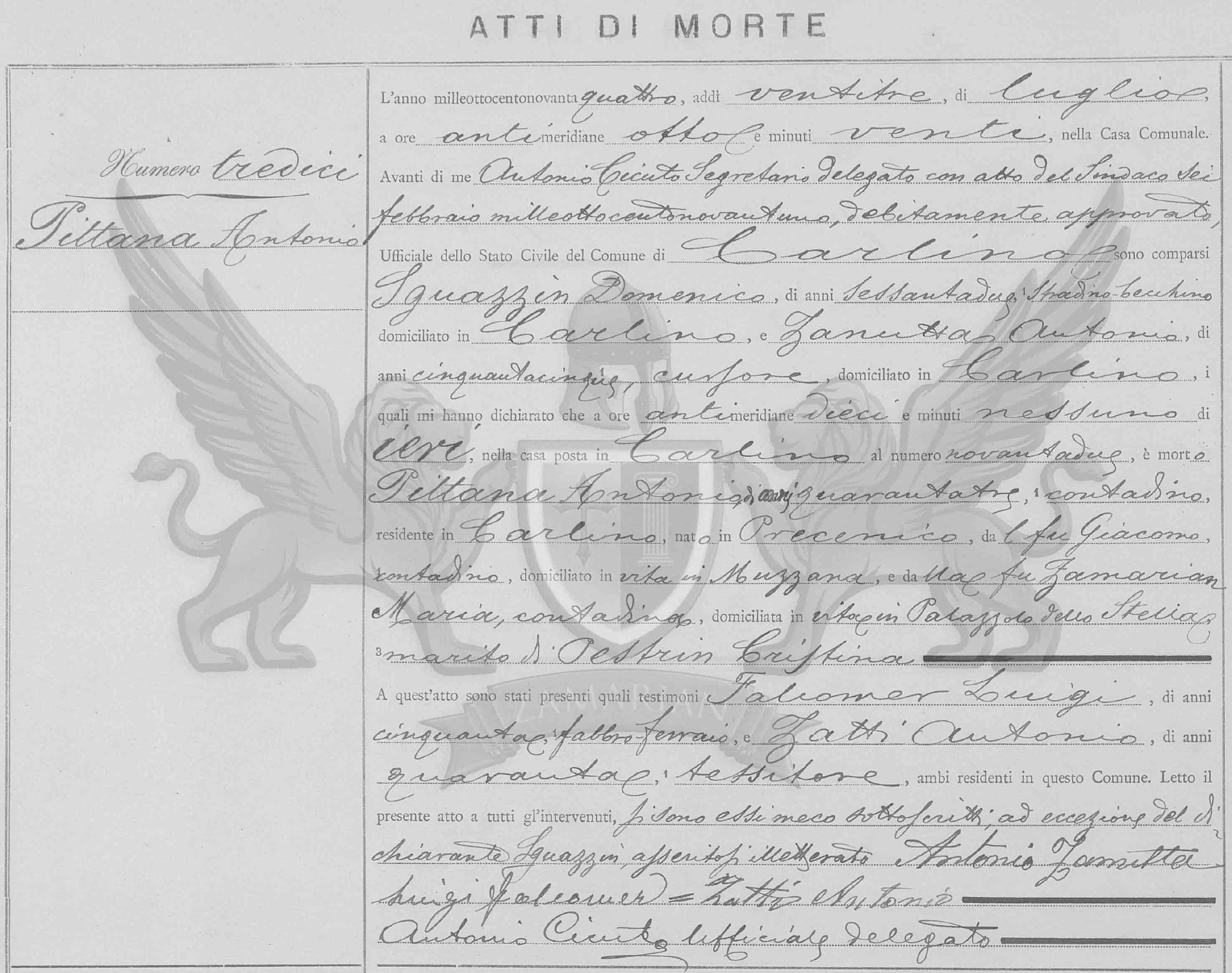 Diante de mim Antonio Cicuto Secretário delegado com ato do Síndico seis de fevereiro de mil oitocentos e noventa e um, devidamente aprovado Oficial do Estado Civil do Município de Carlino, compareceram Iguazzin Domenico, de sessenta e dois anos, técnico em pavimentação, domiciliado neste em Carlino, e Zanata Antonio, de cinquenta e dois anos, cursor, domiciliado em Carlino, os quais me declararam que as dez horas da manhã, de ontem na casa situada em Carlino, ao número noventa e dois, faleceu Pittana Antonio de quarenta e três anos, camponês, residente em Carlino nascido em Precenicco, filho do finado Giacomo, camponês, domiciliado em vida em Muzzana e da finada Zamarian Maria, camponesa, domiciliada em vida em Palazzolo dello Stella, marido de Pestrin Cristina.