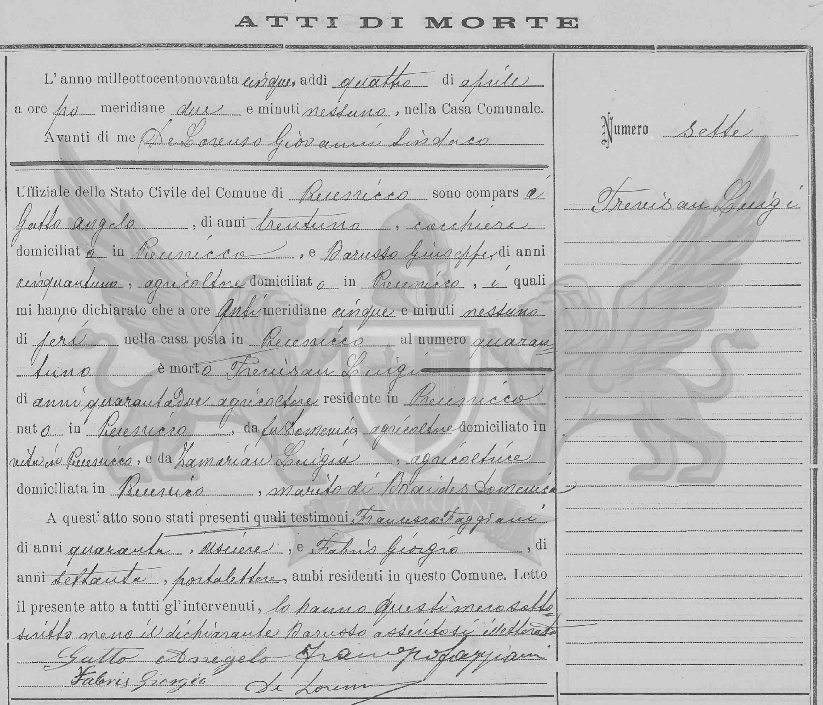Diante de mim De Lorenzo Giovanni Síndico Oficial do Registro Civil do Município de Precenicco, compareceram Gatto Angelo, de trinta e um anos, cocheiro, domiciliado em Precenicco, e Barusso Giuseppe, de cinquenta e um anos, agricultor, domiciliado em Precenicco, os quais me declararam que às cinco horas da manhã, de ontem, na casa situada em Precenicco, ao número quarenta e um, faleceu Trevisan Luigi, de quarenta e dois anos, agricultor, residente em Precenicco, nascido em Precenicco, filho de Domenico, agricultor, domiciliado em vida em Precenicco, e de Zamarian Luigia, agricultora, domiciliada em Precenicco, marido de Braides Domenica.