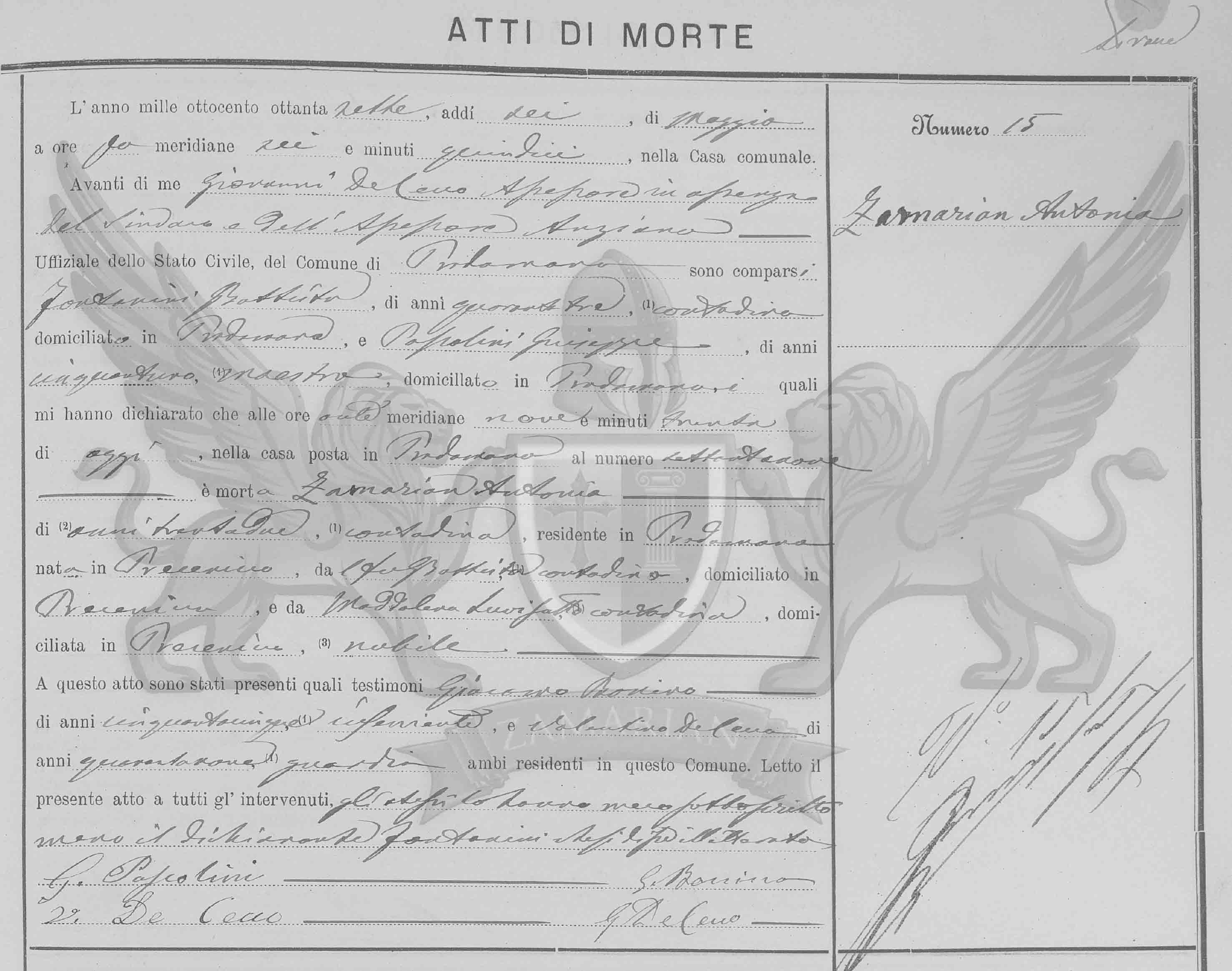 Diante de mim Giovanni Delano assessor em ausência do Síndico e do assessor mais antigo Oficial do Estado Civil do Município de Pradamano, compareceram Fontanini G Battista, de quarenta e três anos, camponês, domiciliado em Pradamano, e Popolini Giuseppe, de cinquenta e um anos, professor, domiciliado em Pradamano, os quais me declararam que às nove horas e trinta minutos da manhã, de hoje na casa situada em Pradamano, ao número setenta e nove, faleceu Zamarian Antonia de trinta e dois anos, camponesa, residente em Pradamano nascida em Precenicco, filha do finado Giovanni Battista agricultor, domiciliado em Precenicco, e da finada Maddalena Luvisutti, camponesa, domiciliada em Precenicco, solteira.