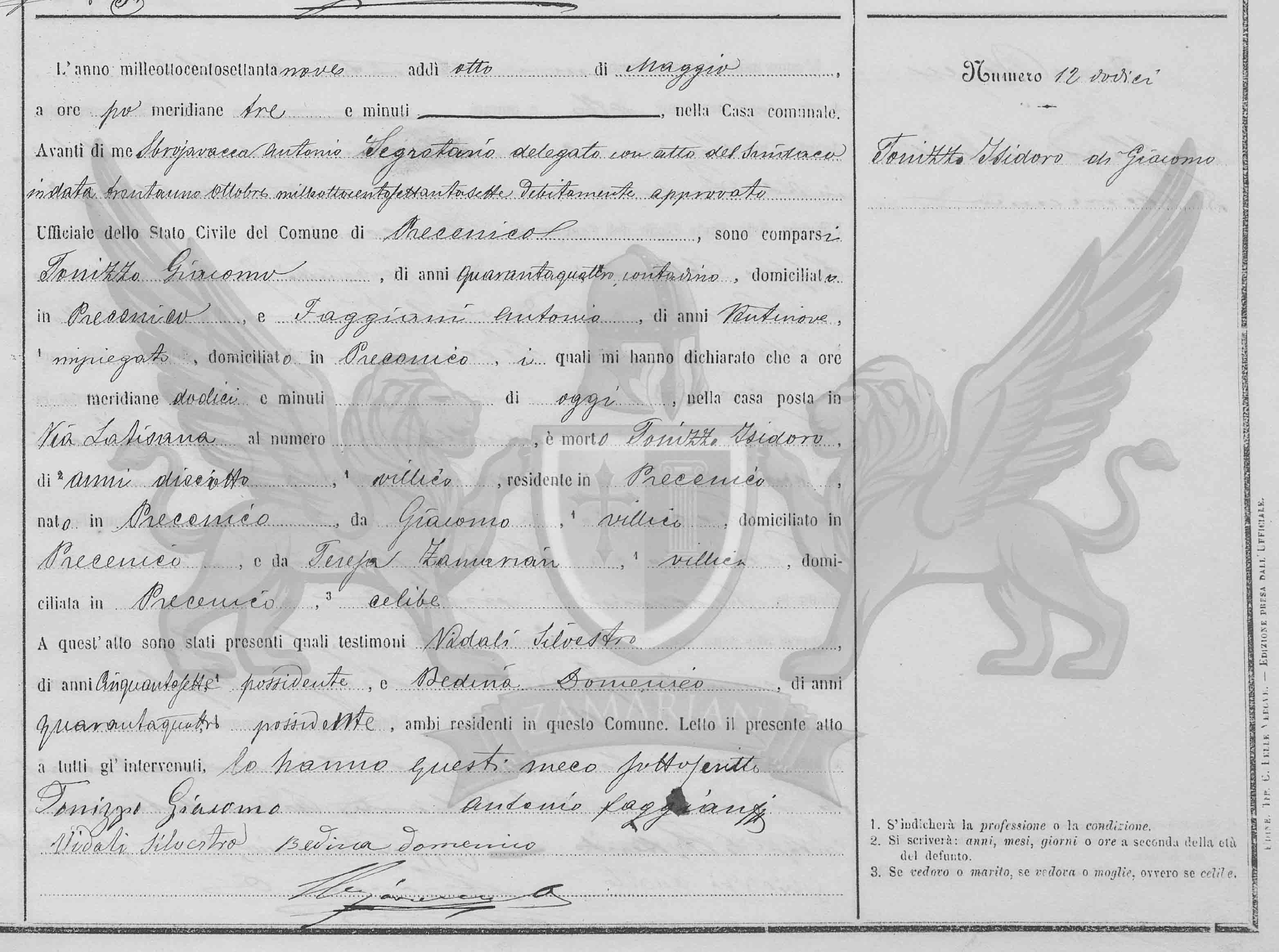 Diante de mim Sbrajavacea Antonio secretário delegado com ato do Síndico em data trinta e um de outubro de mil oitocentos e setenta e sete devidamente aprovado Oficial do Registro Civil do Município de Precenicco, compareceram Tonizzo Giacomo, de quarenta e quatro anos, camponês, domiciliado em Precenicco, e Faggiani Antonio, de vinte e nove anos, empregado, domiciliado em Precenicco, os quais me declararam que ao meio dia, de hoje, na casa situada em Via Latisana, faleceu Tonizzo Isidoro, de dezoito anos, camponês, residente em Precenicco, nascido em Precenicco, filho de Giacomo, camponês, domiciliado em Precenicco, e de Teresa Zamarian, camponesa, domiciliada no citado local, solteiro.