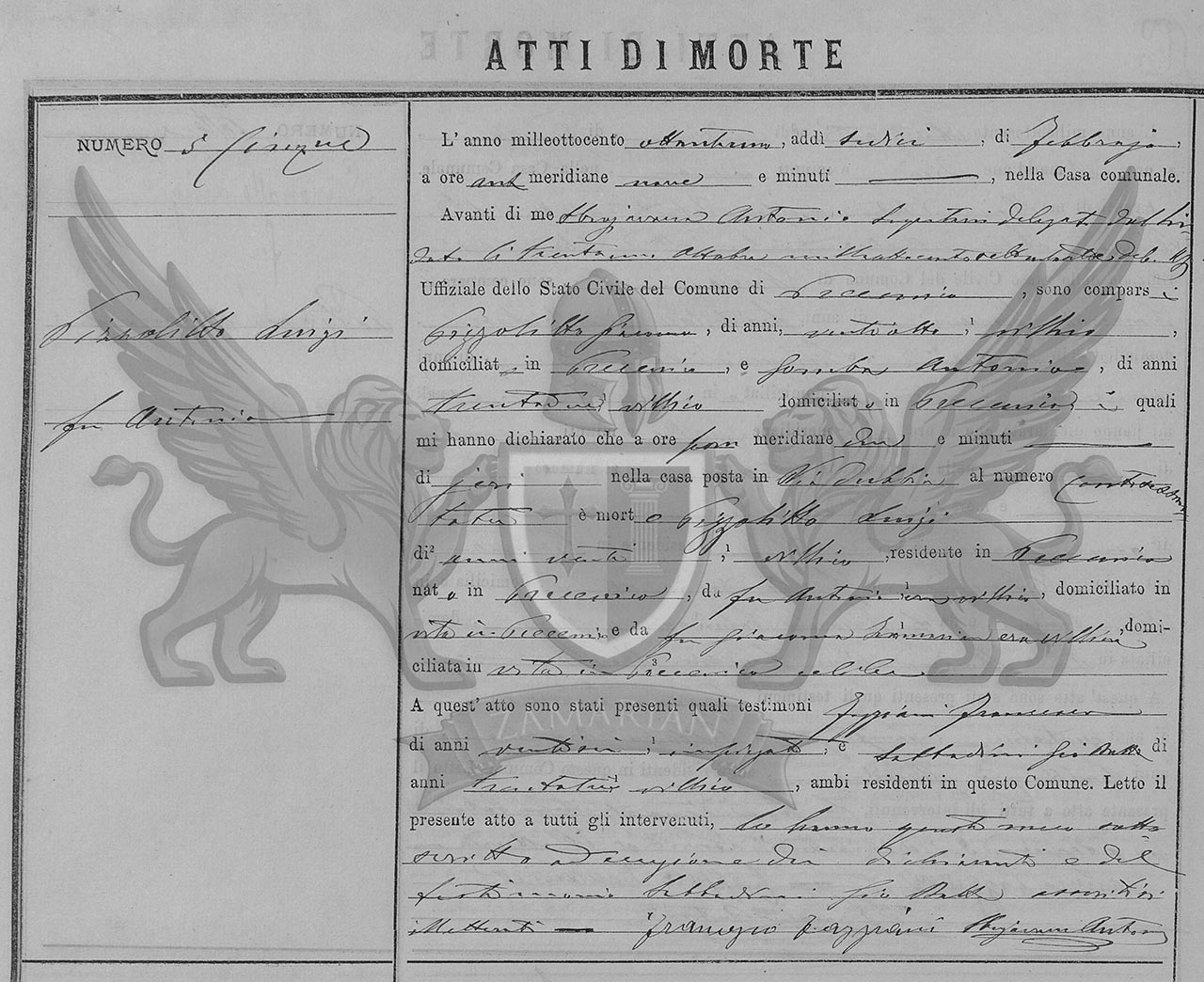 Diante de mim Sbrajavacea Antonio, secretário delegado pelo Síndico no dia trinta e um de outubro de mil oitocentos e oitenta e três devidamente aprovado Oficial do Registro Civil do Município de Precenicco, compareceram Pizzolitto Giacomo, de vinte e oito anos, camponês, domiciliado em Precenicco, e Gamba Antonio, de trinta e um anos, camponês, domiciliado em Precenicco, os quais me declararam que as duas horas da tarde, de ontem na casa situada em Via Dubbia, ao número oitenta e três, faleceu Pizzolitto Luigi de vinte anos, camponês, residente em Precenicco nascido em Precenicco, filho do finado Antonio, era camponês, domiciliado em vida em Precenicco, e da finada Giacoma Zamarian, era camponesa, domiciliada em vida em Precenicco, solteiro.