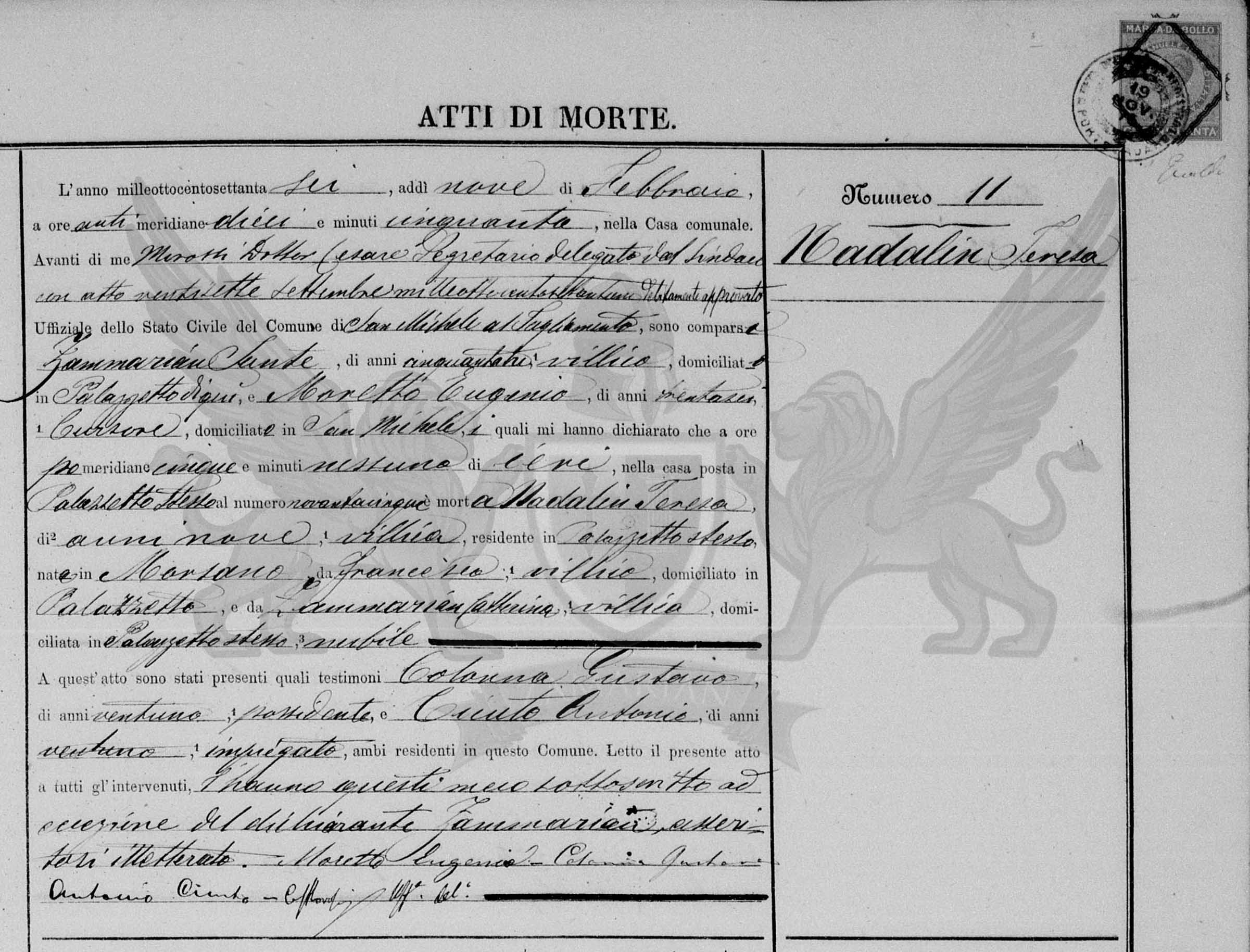 Diante de mim Morossi Doutor Cesare secretário delegado do Síndico com ato vinte e sete de setembro de mil oitocentos e setenta e um devidamente aprovado Oficial do Estado Civil do Município de San Michele al Tagliamento, compareceram Zammarian Sante, de cinquenta e um anos, camponês, domiciliado em Palazzetto daqui, e Moretto Eugenio de trinta e seis anos, cursor, domiciliado em San Michele, os quais me declararam que às pós meridiana cinco horas de ontem, na casa situada na mesma Palazzetto ao número noventa e cinco, faleceu Nadalin Teresa de nove anos, camponesa, residente em Palazzetto, nascida em Morsano, (filha) de Francesco, camponês, domiciliado em Palazzetto, e de Zammarian Catterina, camponesa, domiciliada na referida Palazzetto, solteira.