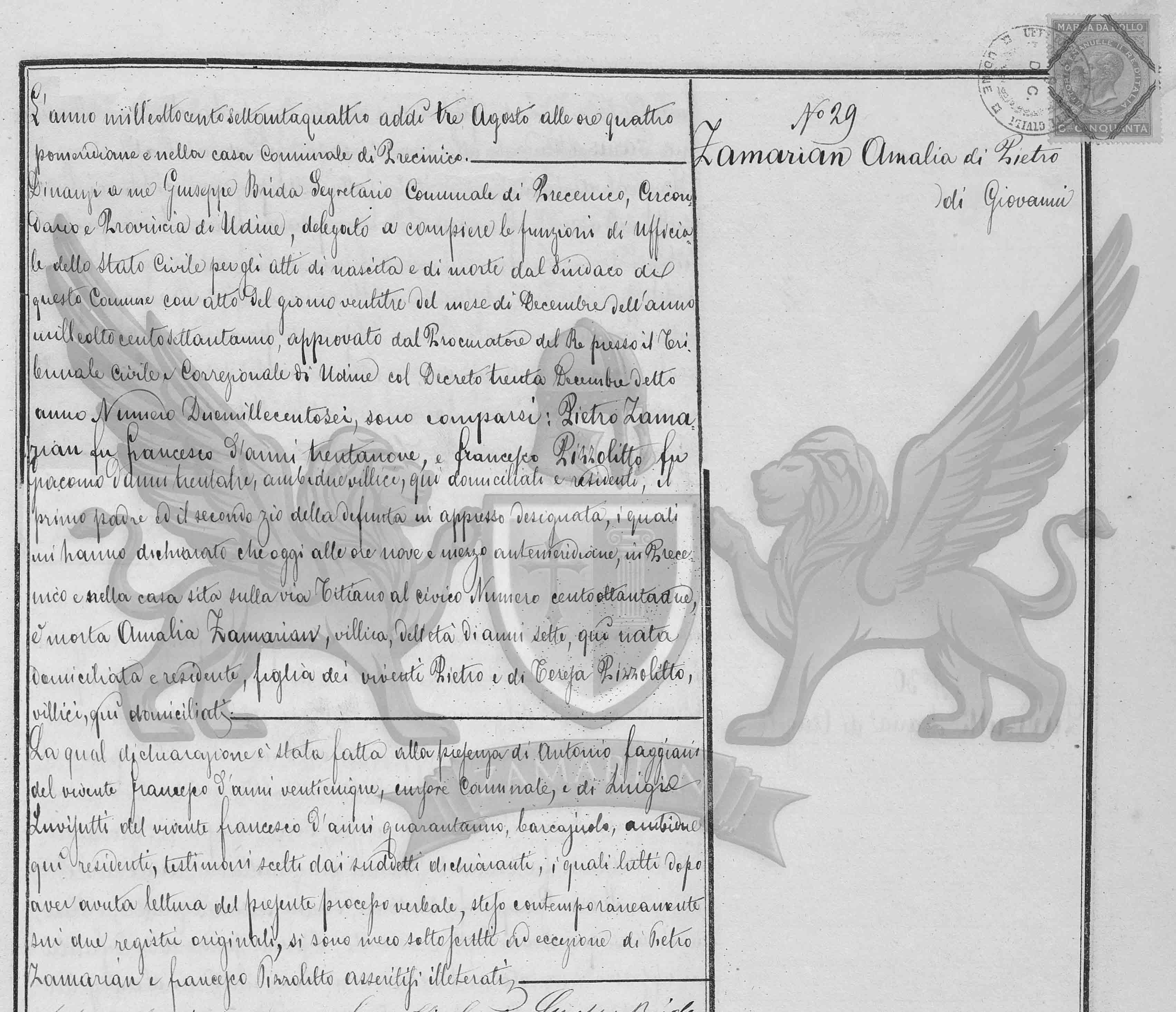 Diante de mim Giuseppe Brida secretário Municipal de Precenicco, Circundário e Província de Udine, delegado a cumprir as funções de Oficial do Estado Civil para os atos de nascimento e de morte do Síndico deste Município com ato do dia vinte e três do mês de Dezembro do ano de mil oitocentos e setenta e um, aprovado pelo Procurador do Rei junto ao Tribunal Civil e Correcional de Udine com Decreto de trinta de Dezembro do citado ano Número Dois mil cento e seis, compareceram: Pietro Zamarian filho do falecido Francesco, de trinta e nove anos, e Francesco Pizzolitto filho do finado Giacomo, de trinta e três anos, ambos dois camponeses, aqui domiciliados e residentes, o primeiro pai e o segundo tio da falecida em apresso designada, os quais me declararam que hoje às nove hora e trinta minutos ante meridianas, em Precenicco e na casa situada sobre a via Tittiano ao cívico número cento e oitenta e dois, faleceu Amalia Zamarian, camponesa, de sete anos de idade, aqui nascida, domiciliada e residente, filha dos viventes Pietro e Teresa Pizzolitto, camponeses, aqui domiciliados.