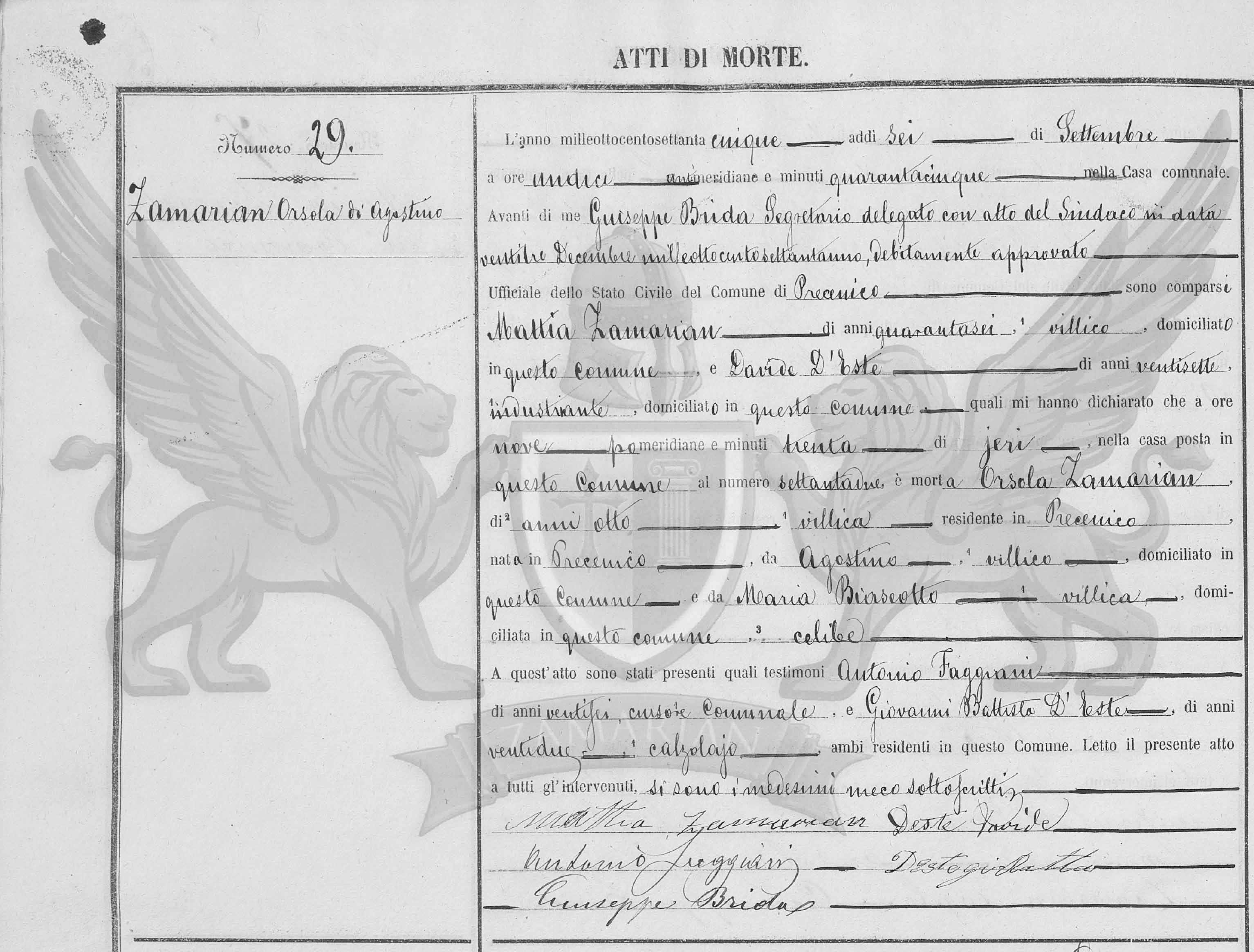 Diante de mim Giuseppe Brida secretário delegado com ato do Síndico em data vinte e três de dezembro de mil oitocentos e setenta e um, devidamente aprovado Oficial do Registro Civil do Município de Precenicco, compareceram Mattia Zamarian, de quarenta e seis anos, camponês, domiciliado neste Município, e Dante D’Este, de vinte e sete anos, camponês, domiciliado neste município, os quais me declararam que às nove horas e trinta minutos da noite, de ontem, na casa situada neste município, ao número setenta e dois, faleceu Orsola Zamarian, de oito anos, camponesa, residente em Precenicco, nascida em Precenicco, filha de Agostino, camponês, domiciliado neste município, e de Maria Blaseotto, camponesa, domiciliada neste município, solteira.