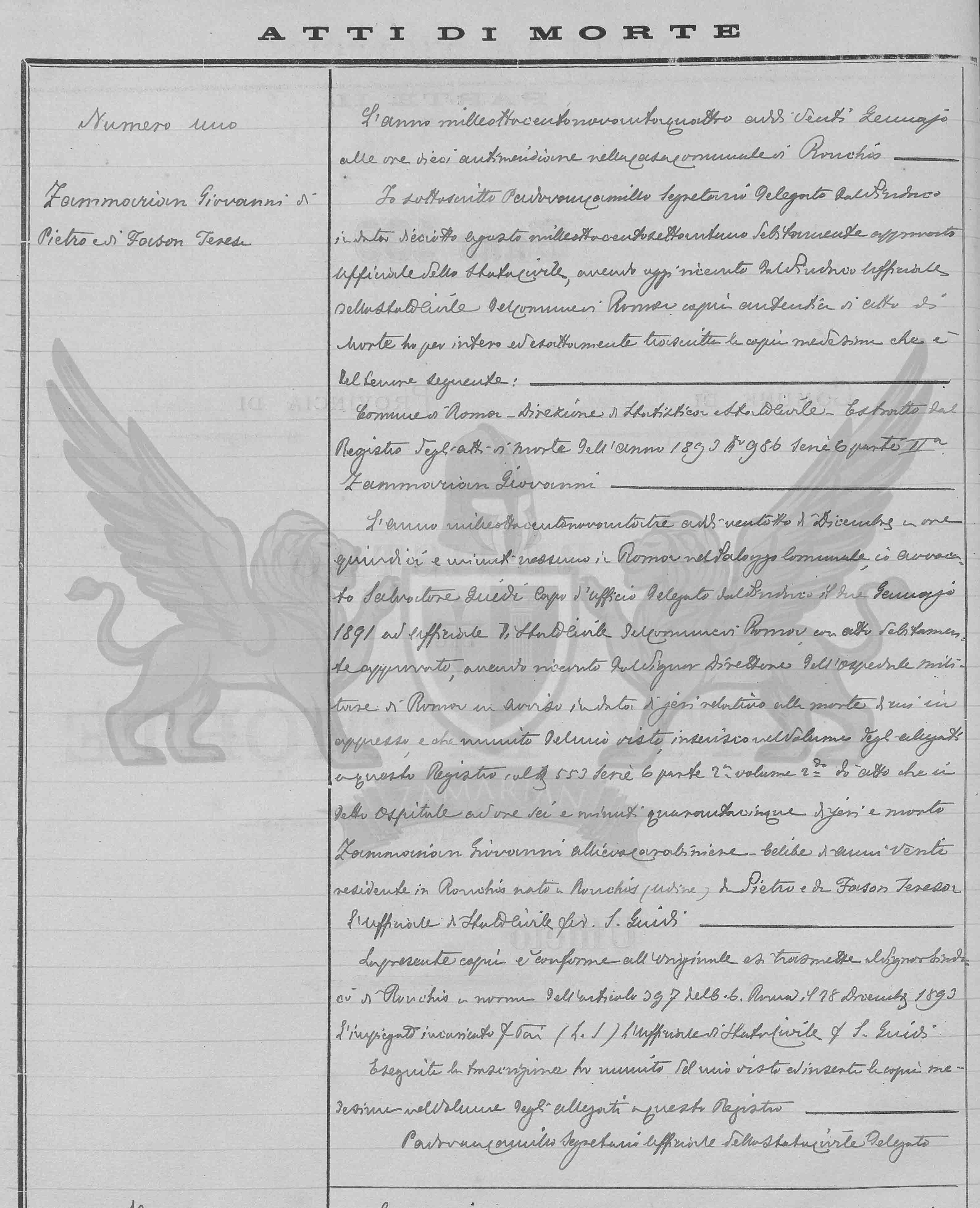 Ano milo oitocentos e noventa e três aos dias vinte e oito de dezembro, às quinze horas em Roma no Palácio Municipal, eu advogado Salvatore Guidi Chefe de Ofício Delegado pelo Síndico dia dois de janeiro de 1891 e Oficial do Estado Civil do Município de Roma com ato devidamente aprovado, havendo recebido do Senhor Diretor do Hospital Militar de Roma em Aviso na data de ontem relativo ao falecimento do qual em apresso e que munido do meu visto, inseri no volume dos anexos deste registro ao 553 Série 6 2º Volume 2º ato que se diz do Hospital às seis horas e quarenta e cinco minutos de ontem faleceu Zamarian Giovanni aspirante carabineiro, solteiro de vinte anos residente em Ronchis nascido em Ronchis (Udine) filho de Pietro e de Fason Teresa.