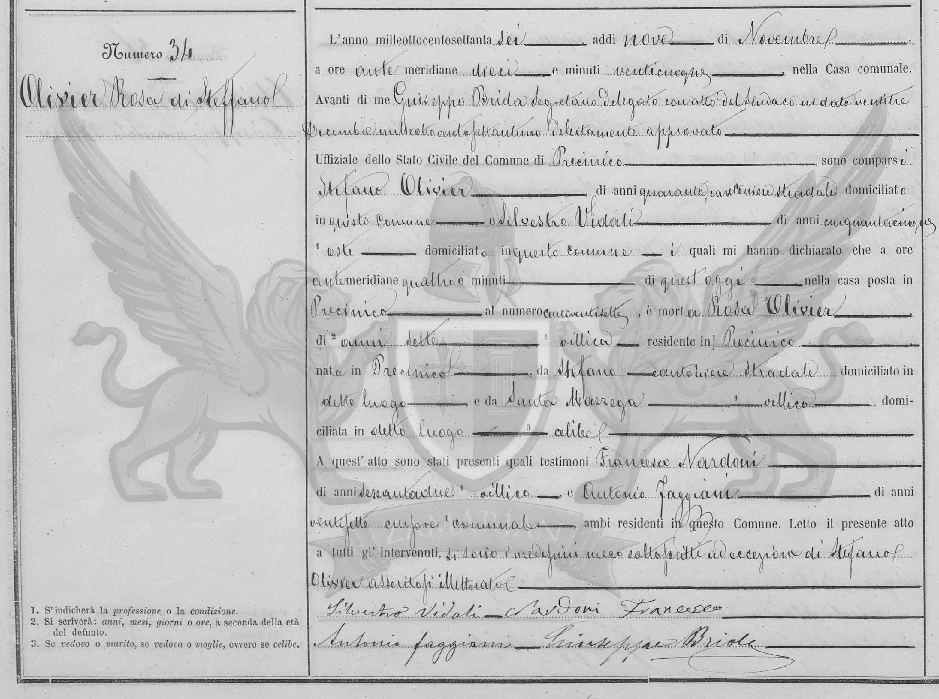 Diante de mim Giuseppe Brida Secretário delegado com ato do síndico em data vinte e três de Dezembro de mil oitocentos e setenta e um devidamente aprovado Oficial do Estado Civil do Município de Precenicco, compareceram Stefano Olivier, de quarenta anos, cantoneiro de estradas, domiciliado neste Município, e Silvestro Vidali, de cinquenta e cinco anos, garçom, domiciliado neste Município, os quais me declararam que às anti meridianas quatro horas na casa situada em Precenicco ao número cento e vinte e sete, faleceu Rosa Olivier de sete anos, camponesa, residente em Precenicco nascida em Precenicco, filha de Stefano, cantoneiro de estradas, domiciliado no citado local, e de Santa Mazzega, camponesa, domiciliada no citado local, solteira.