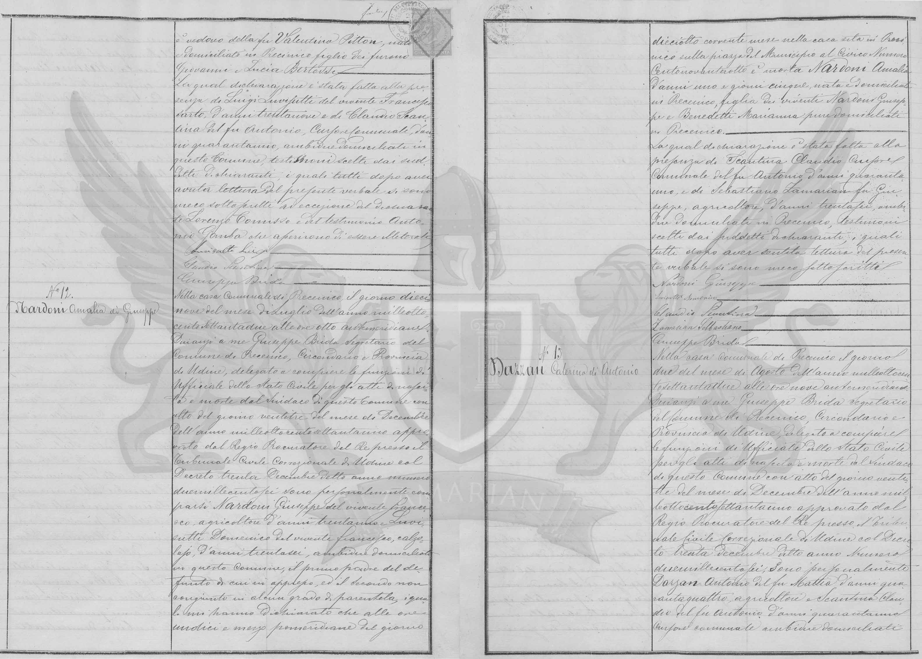 Diante de mim Giuseppe Brida Secretário do Município de Precenicco, Circundário e Província de Udine, delegado e a cumprir as funções de Oficial do Estado Civil pelos atos de nascimento e falecimento do Síndico deste Município com ato do dia vinte e três do mês de Dezembro do ano de mil oitocentos e setenta e um aprovado pelo Regio Procurador do Rei junto ao Tribunal Civil Correcional de Udine com Decreto dia trinta de Dezembro do citado ano número dois mil cento e seis compareceram pessoalmente Nardoni Giuseppe filho do vivente Francesco, agricultor de trinta e um anos e Luvizutti Domenico do vivente Francesco, sapateiro, de trinta e seis anos, ambos dois domiciliados neste Município, o primeiro pai do falecido do qual em apresso, e o segundo sem relação de parentesco, iguais me declararam que às onze horas e trinta minutos pós meridianas do dia dezoito do corrente mês na casa situada em Precenicco sobre a praça do Município ao Cívico Número Cento e noventa e oito faleceu Nardoni Amalia de um ano e cinco dias, nascida e domiciliada em Precenicco, filha dos viventes Nardoni Giuseppe e Benedetti Marianna também domiciliada em Precenicco.