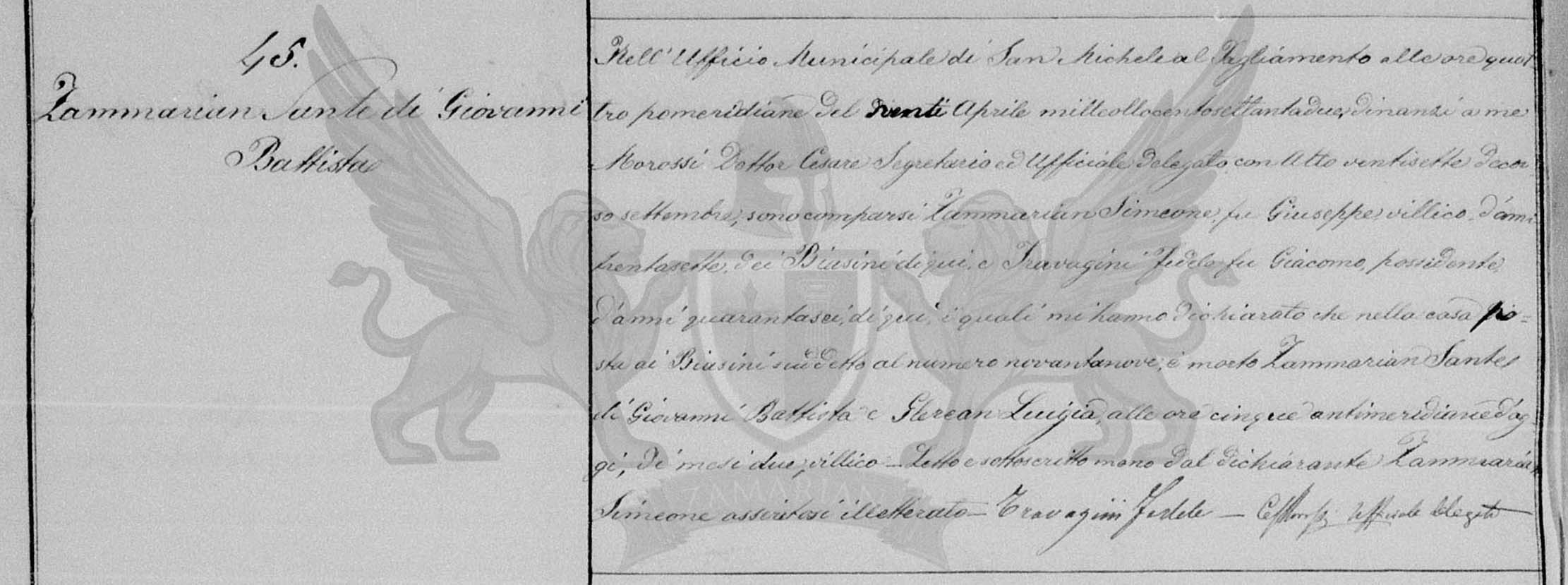 No Ofício Municipal de San Michele al Tagliamento às pós-meridiana quatro horas de vinte de Abril de mil oitocentos e setenta e dois, diante de mim Marosi Doutor Cesare Secretário e oficial Delegado com ato vinte e sete do decorrido setembro, compareceram Zammarian Simone filho do falecido Giuseppe, camponês, de trinta e sete anos de Biasini daqui, e Travagini Fedele filho do falecido Giacomo, proprietário, de quarenta e seis anos, daqui, os quais me declararam que na casa situada em Biasini supracitado ao número noventa e nove, faleceu Zammarian Sante filho de Giovanni Battista e Glerean Luigia, às anti-meridiana cinco horas de hoje, de dois meses, camponês. Lido e subscrito, menos pelo declarante Zammarian Simone declarando-se iletrado.