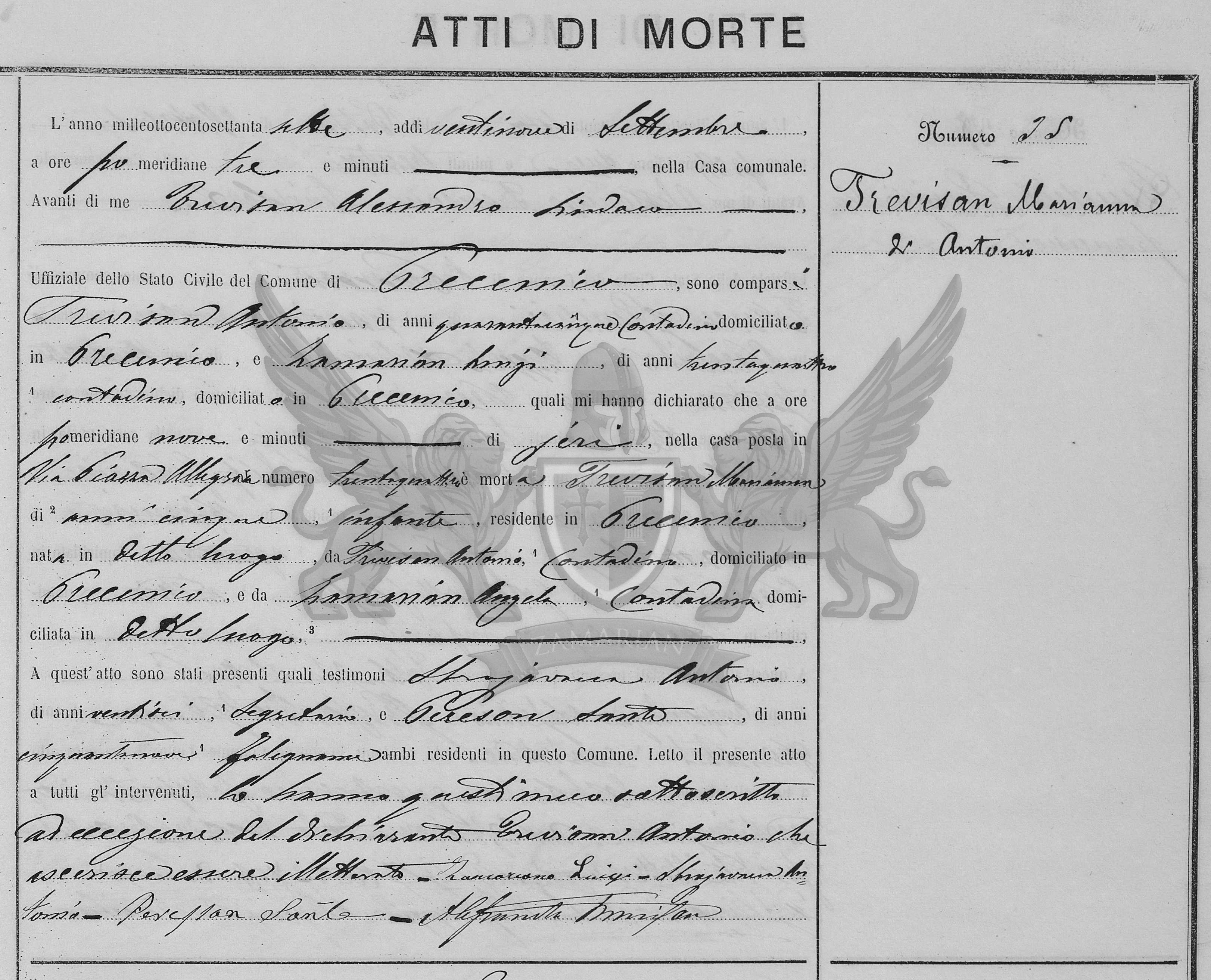Diante de mim Prussian Alessandro Síndico Oficial do Registro Civil do Município de Precenicco, compareceram Trevisan Antonio, de quarenta e cinco anos, camponês, domiciliado em Precenicco, e Zamarian Luigi, de trinta e quatro anos, camponês, domiciliado em Precenicco, os quais me declararam que às nove horas da noite, de ontem, na casa situada em Via Piazza Allegrette, ao número trinta e quatro, faleceu Trevisan Marianna, de cinco anos, infante, residente em Precenicco, nascido no referido lugar, filho de Trevisan Antonio, camponês, domiciliado em Precenicco, e de Zamarian Angela, camponesa, domiciliada no referido local.