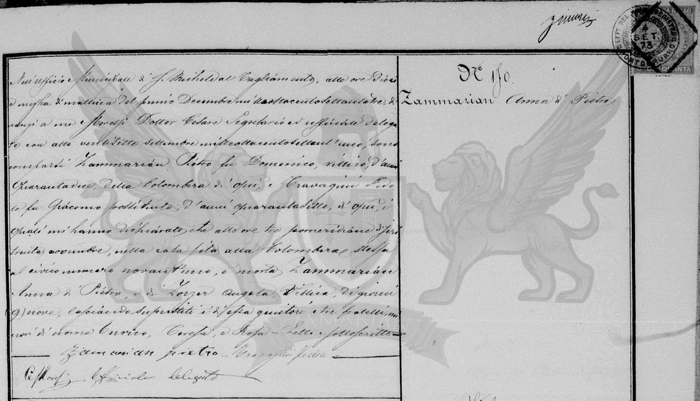 No Ofício Municipal de San Michele al Tagliamento às dez horas e trinta minutos pela manhã de primeiro de Dezembro de mil oitocentos e setenta e três, diante de mim Morosi Doutor Cesare Secretário e oficial Delegado com ato vinte e sete setembro de mil oitocentos e setenta e um, compareceram Zammarian Pietro filho do falecido Domenico, camponês, de quarenta e dois anos de Colombara daqui, e Travagini Fedele filho do falecido Giacomo, proprietário, de quarenta e sete anos, daqui, os quais me declararam que , às pós-meridiana três horas de ontem trinta de novembro, na casa situada na mesma Colombara ao cívico número noventa e um, faleceu Zammarian Anna filha de Pietro e Zorzer Angela, de nove (9) dias, deixando sobreviventes os dessa genitores e três irmãos menores de nome Enrico, Teresa e Rosa. Lido e subscrito.