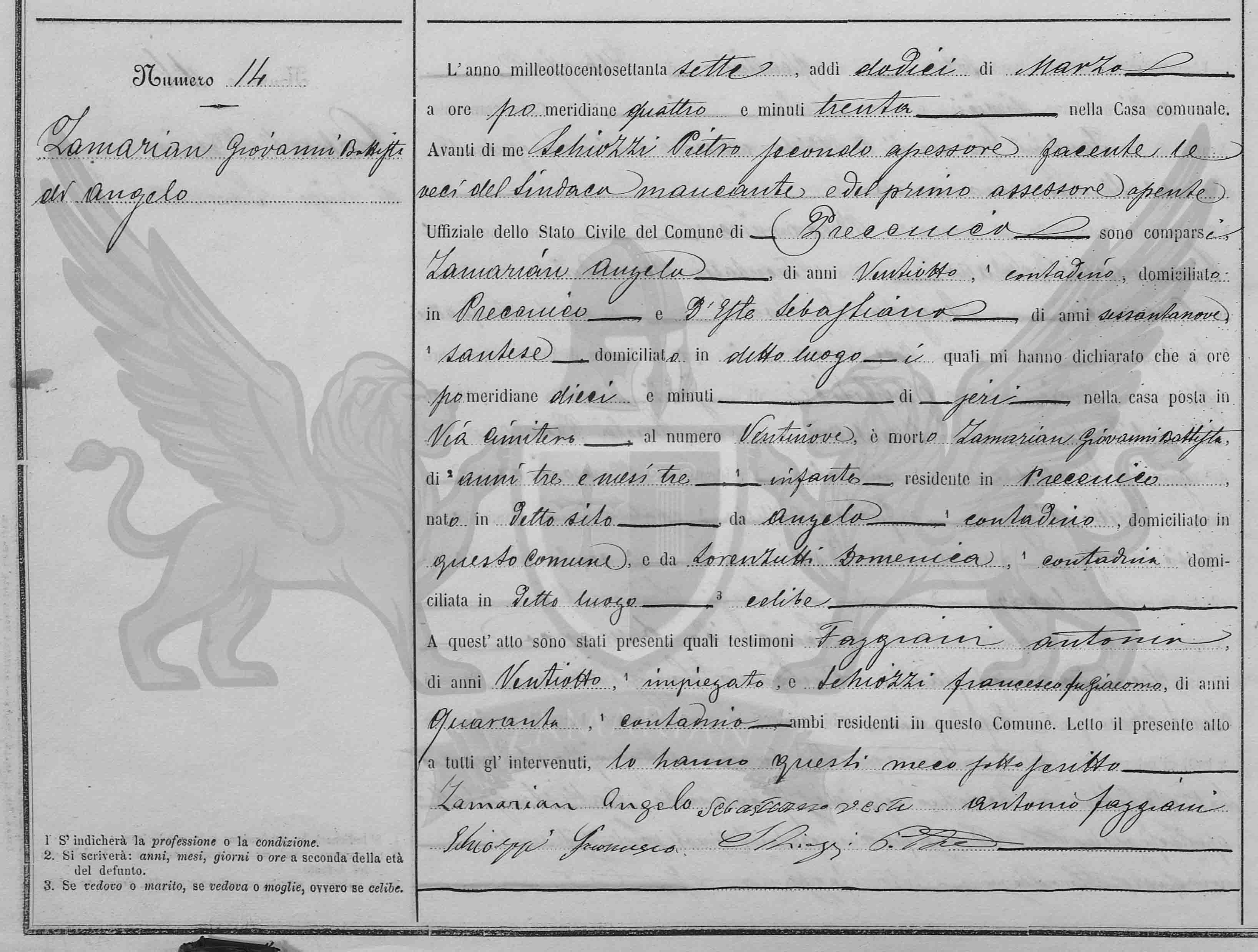 Diante de mim Schiozzi Pietro segundo assessor fazendo as vozes do Síndico faltante e do primeiro assessor ausente Oficial do Registro Civil do Município de Precenicco, compareceram Zamarian Angelo, de vinte e oito anos, camponês, domiciliado em Precenicco, e D’Este Sebastiano, de sessenta e nove anos, domiciliado no citado local, os quais me declararam que ao dez horas e dez minutos da noite, de ontem, na casa situada em Via Cimitero, ao número vinte e nove, faleceu Zamarian Giovanni Battista, de três anos e três meses, infante, residente em Precenicco, nascido no referido local, filho de Angelo, camponês, domiciliado neste Município, e de Lorenzutti Domenica, camponesa, domiciliada no citado local, solteiro.
