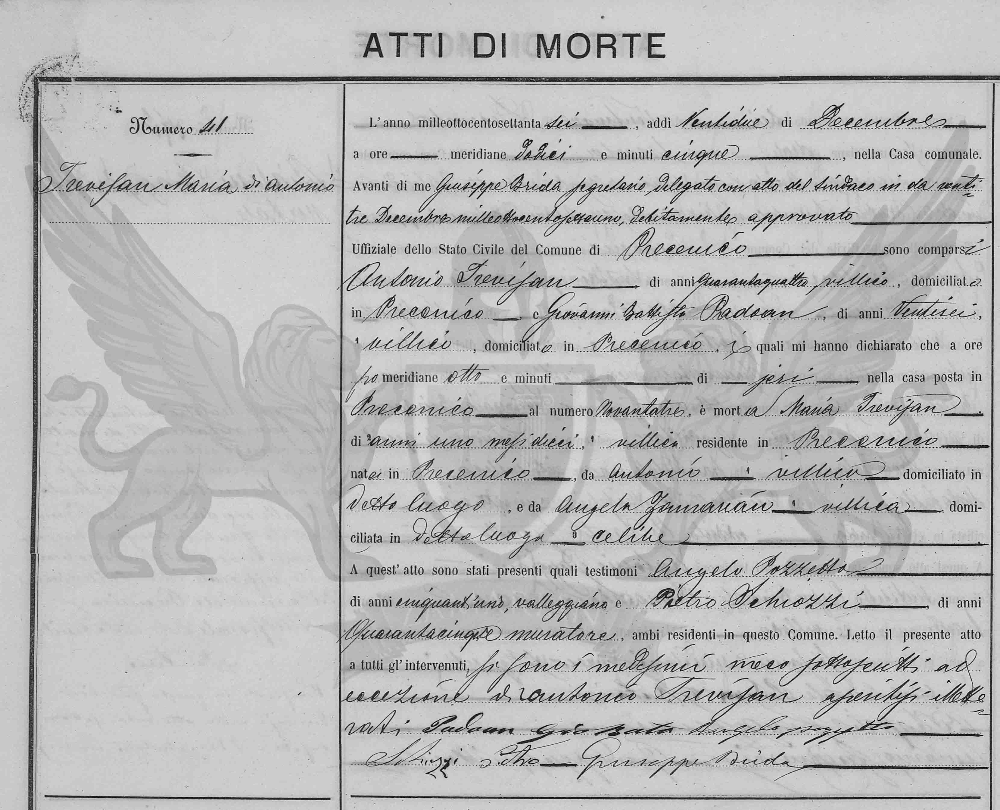 Diante de mim Giuseppe Brida secretário, delegado com ato do Síndico em vinte e três de dezembro de mil oitocentos e setenta e um, devidamente aprovado Oficial do Registro Civil do Município de Precenicco, compareceram Antonio Trevisan, de quarenta e quatro anos, camponês, domiciliado em Precenicco, e Giovanni Battista Padoan, de vinte e seis anos, camponês, domiciliado em Precenicco, os quais me declararam que às pós meridiana oito horas, de ontem, na casa situada em Precenicco, ao número noventa e três, faleceu Maria Trevisan, de 1 ano e dez meses, camponesa, residente em Precenicco, nascida em Precenicco, filha de Antonio, camponês, domiciliado no referido local, e de Angela Zamarian, camponesa, domiciliada no referido local, solteira.