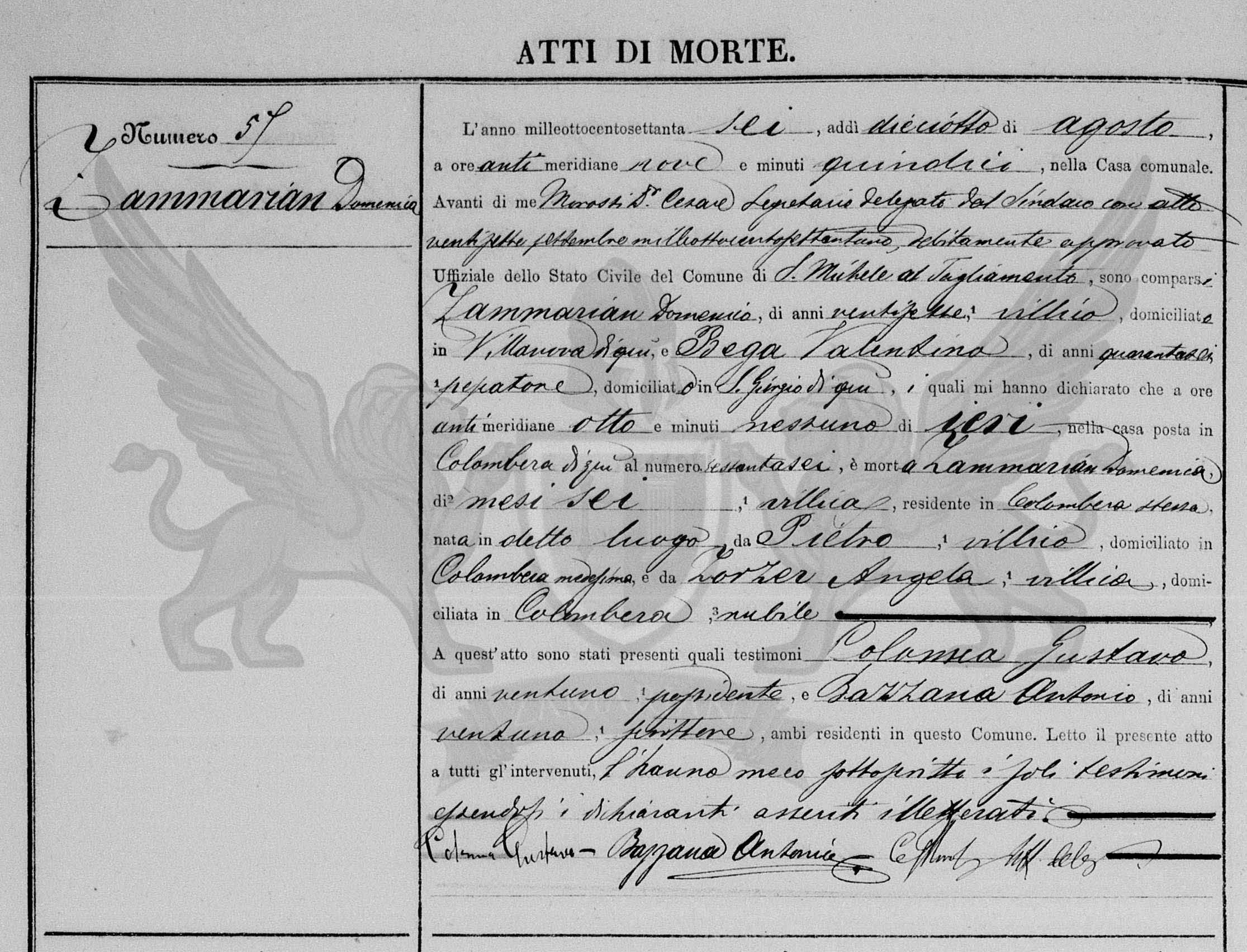 Diante de mim Morossi Doutor Cesare secretário delegado do Síndico com ato vinte e sete de setembro de mil oitocentos e setenta e um devidamente aprovado Oficial do Estado Civil do Município de San Michele al Tagliamento, compareceram Zammarian Domenico, de vinte e seis anos, camponês, domiciliado em Villanova daqui, e Bega Valentino de quarenta e seis anos, frisador, domiciliado em San Michele, os quais me declararam que às anti meridiana oito horas de ontem, na casa situada em Colombara daqui ao número sessenta e seis, faleceu Zammarian Domenica de seis meses, camponesa, residente na mesma Colombara, nascida em referido local, (filha) de Pietro, camponês, domiciliado na referida Colombara, e de Zorzer Angela, camponesa, domiciliada em Colombara, solteira.