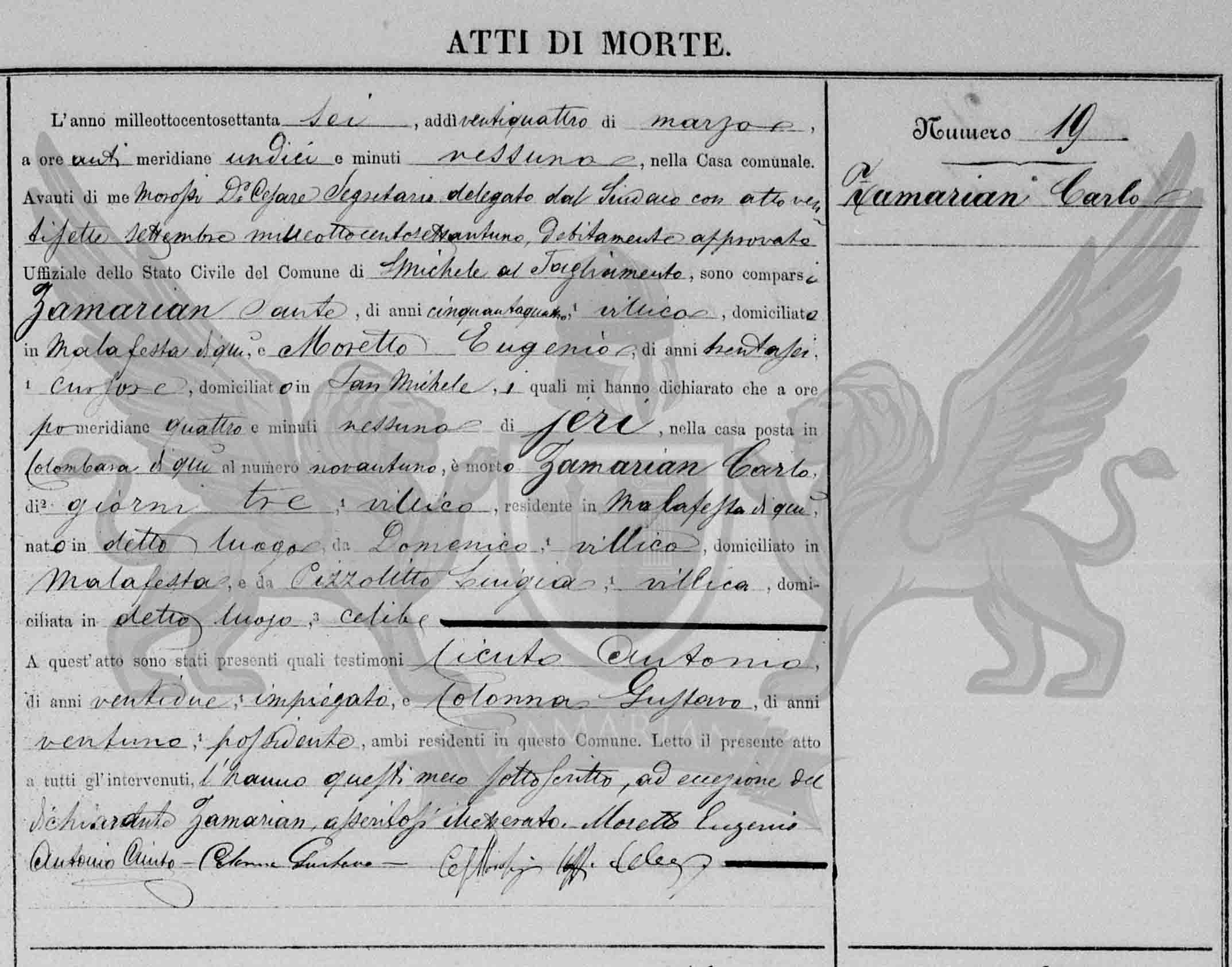 Diante de mim Morossi Doutor Cesare secretário delegado do Síndico com ato vinte e sete de setembro de mil oitocentos e setenta e um devidamente aprovado Oficial do Estado Civil do Município de San Michele al Tagliamento, compareceram Zamarian Sante, de cinquenta e quatro anos, camponês, domiciliado em Malafesta daqui, e Moretto Eugenio de trinta e seis anos, cursor, domiciliado em San Michele, os quais me declararam que às pós meridiana quatro horas de ontem, na casa situada em Colombara daqui ao número noventa e um, faleceu Zamarian Carlo de três dias, camponês, residente em Malafesta daqui, nascido em dito local, (filho) de Domenico, camponês, domiciliado em Malafesta daqui, e de Pizzolitto Luigia, camponesa, domiciliada em citado local, solteiro.