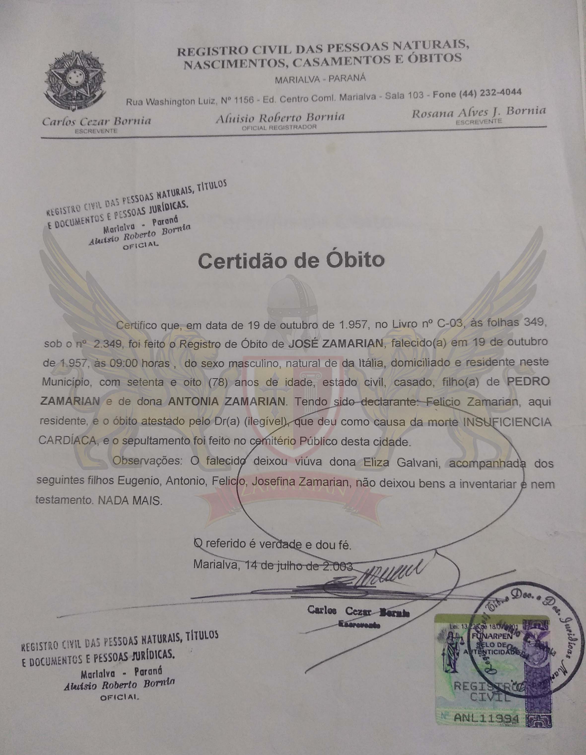 Certifico que, em data de 19 de outubro de 1.957, no Livro nº C-03, às folhas 349, sob o nº 2.349, foi feito o registro de óbito de JOSÉ ZAMARIAN, falecido em 19 de outubro de 1.957, às 09:00 horas, do sexo masculino, natural da Itália, domiciliado e residente neste Município, com setenta e oito (78) anos de idade, estado civil, casado, filho de PEDRO ZAMARIAN e de dona ANTONIA ZAMARIAN. Tendo sido declarante: Felicio Zamarian, aqui residente, e o óbito atestado pelo Dr(a) (ilegível), que deu como causa da morte INSUFICIÊNCIA CARDIACA, e o sepultamento foi feito no cemitério Público desta cidade.
