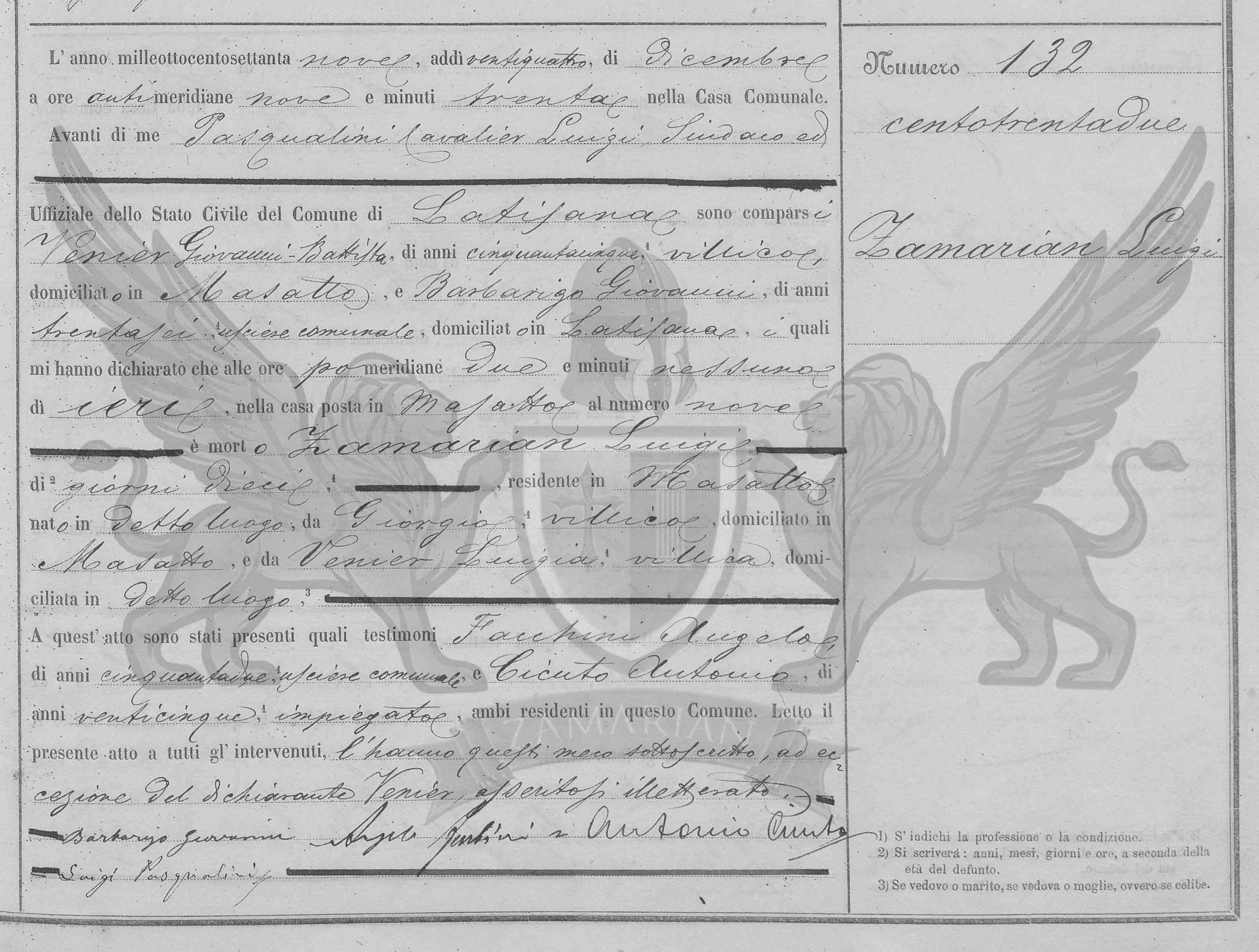 Diante de mim Pasqualini Cavalier Luigi Síndico e Oficial do Registro Civil do Município de Precenicco, compareceram Venier Giovanni Battista, de trinta e seis anos, camponês, domiciliado em Masatto, e Barbarigo Giovanni, de trinta e seis anos, despachante municipal, domiciliado em Latisana, os quais me declararam que às pós meridiana duas horas, de ontem, na casa situada em Masatto, ao número nove, faleceu Zamarian Luigi, de dez dias, —, residente em Masatto, nascido em dito local, (filho) de Giorgio, camponês, domiciliado em Masatto, e de Luigia Vernier, camponesa, domiciliada em dito local.