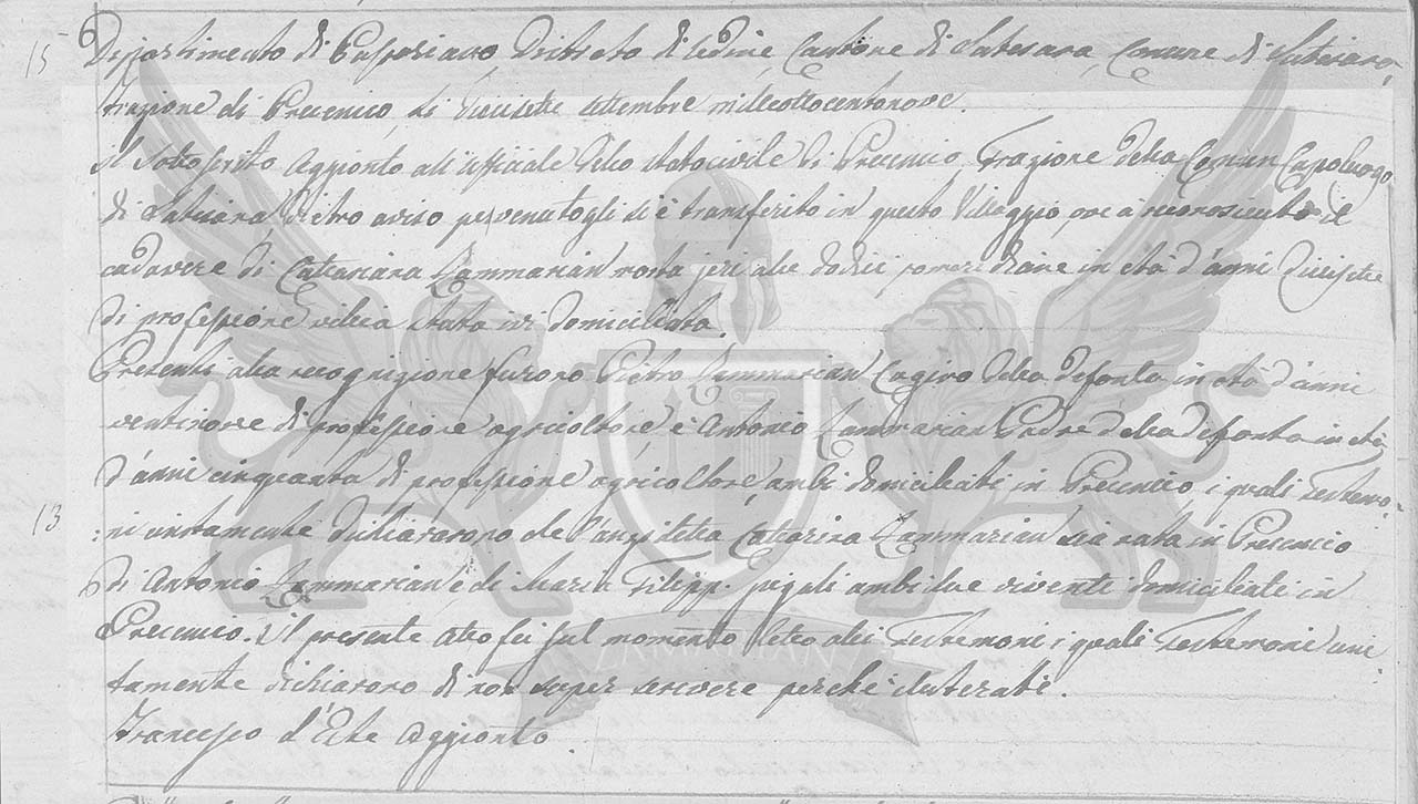 O subscrito adjunto ao oficial do Registro Civil de Precenicco Fração metropolitana de Latisana, diante do aviso recebido se transferiu para aquela região onde reconheceu o cadáver de Cattarina Zammarian falecida ontem ao meio dia com dezessete anos de idade de profissão camponesa onde era domiciliada.