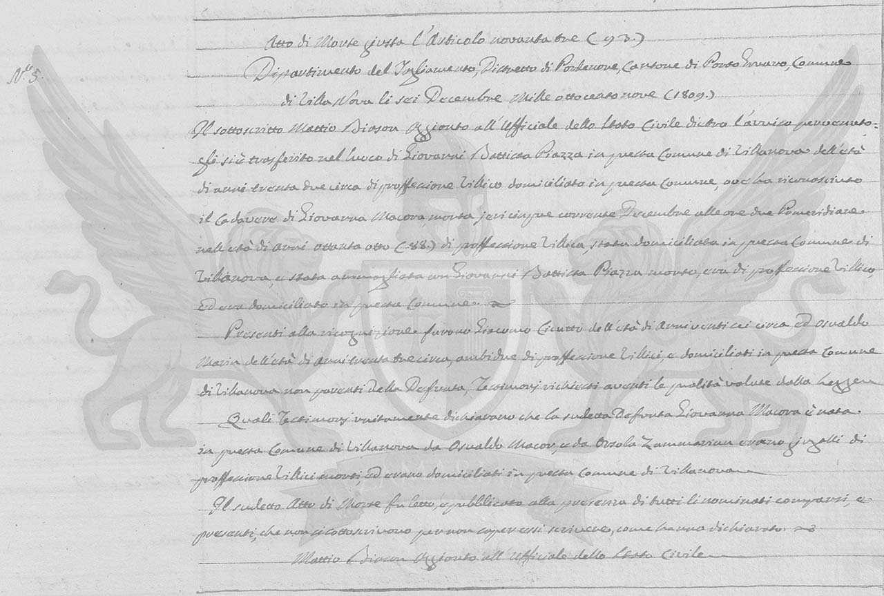 O subscrito Mattia Biason adjunto ao oficial do Registro Civil diante do aviso recebido se transferiu para residência de Giovanni Battista Piazza, neste Município de Villa Nova, com idade de trinta e dois anos aproximadamente de profissão Camponês, domiciliado neste Município onde reconheceu o corpo de Giovanna Macora falecida ontem cinco corrente dezembro às duas horas da tarde com a idade de oitenta e oito anos aproximadamente de profissão Camponesa, era domiciliada neste Município de Villanova, e era amasiada com Giovanni Battista Piazza, falecido, era de profissão Camponês, e era domiciliado neste Município.