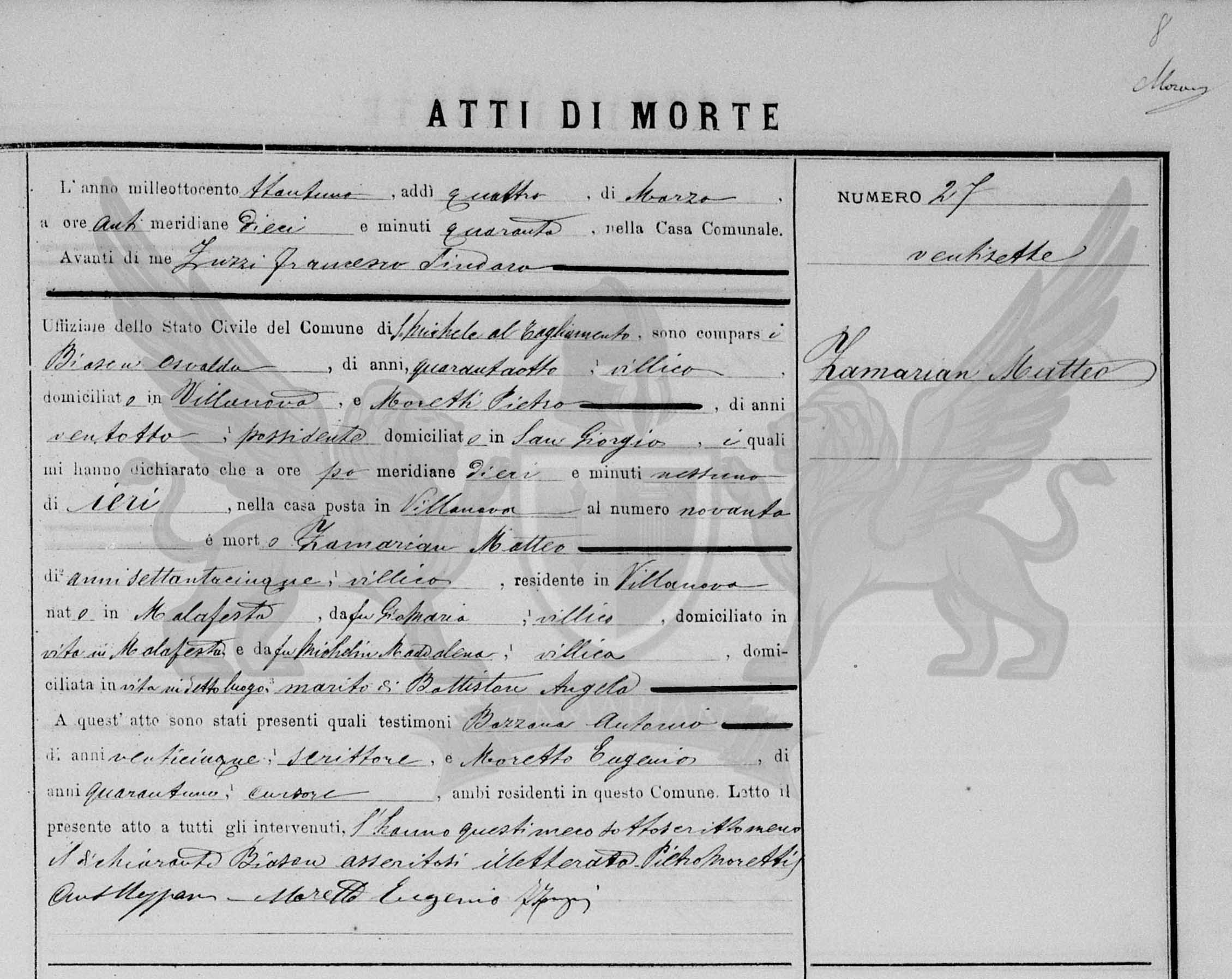 Diante de mim Zuzzi Francesco Síndico Oficial do Registro Civil do Município de San Michele al Tagliamento, compareceram Biason Osvaldo, de quarenta e oito anos, camponês, domiciliado em Villanova, e Moretti Pietro, de vinte e oito anos, proprietário de terras, domiciliado in San Giorgio, os quais me declararam que às pós meridiana dez horas, de ontem, na casa situada em Villanova ao número noventa, faleceu Zamarian Matteo, de setenta e cinco anos, camponês, residente em Villanova, nascido em Malafesta, (filho) do falecido Giovanni Maria, camponês, domiciliado em vida em Malafesta e da falecida Michelin Maddalena, camponesa, domiciliada em vida no referido local, marido de Battiston Angela.