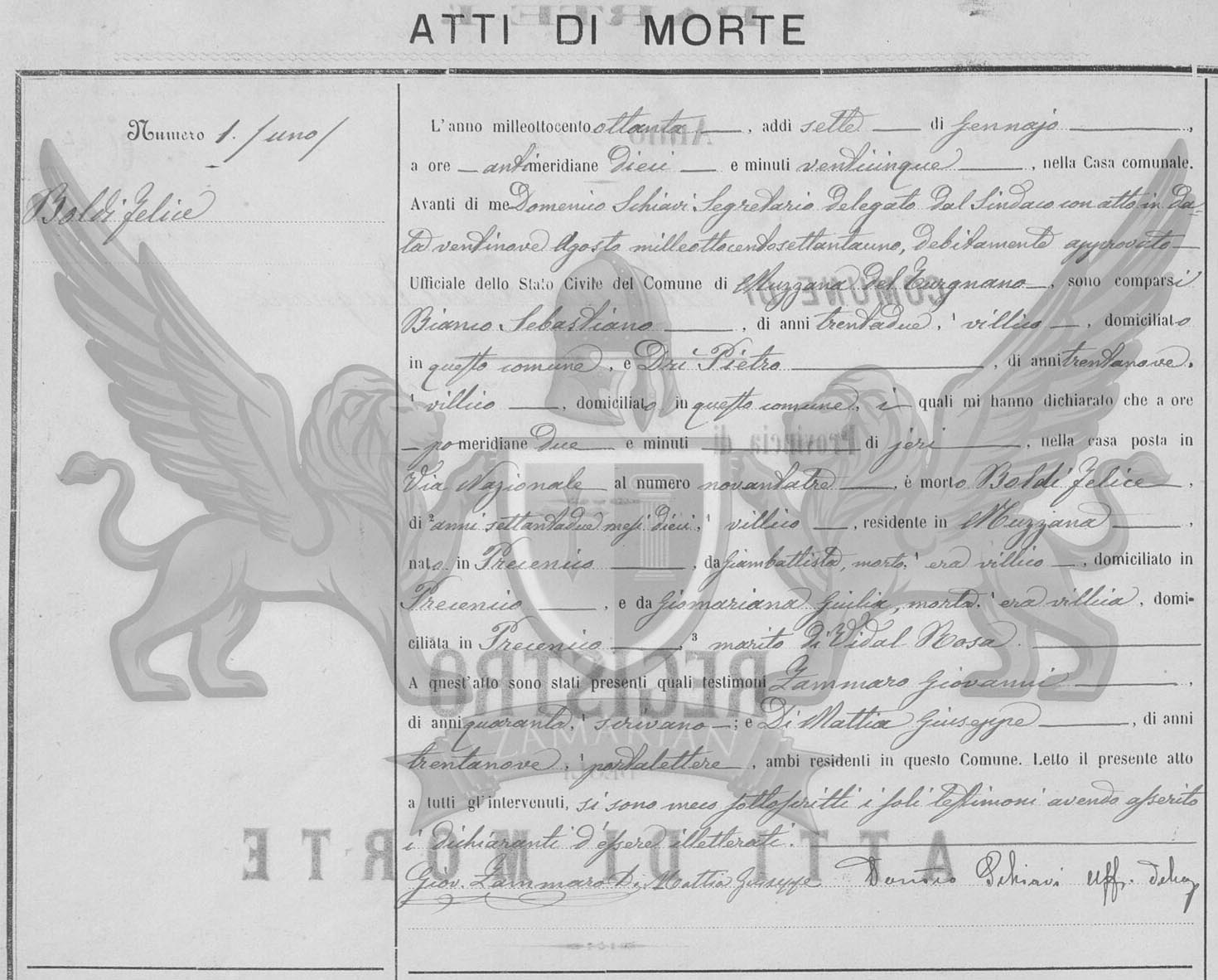 Diante de mim Domenico Schiavi Secretário Delegado pelo Síndico com ato em data vinte e nove de agosto de mil oitocentos e setenta e um, devidamente aprovado Oficial do Estado Civil do Município de Muzzana del Turgnano, compareceram Bianco Sebastiano, de trinta e dois anos, camponês, domiciliado em neste município, e Dri Pietro, de trinta e nove anos, camponês domiciliado em neste município, os quais me declararam que as duas horas da tarde, de ontem na casa situada em Via Nazionale, ao número noventa e três, faleceu Boldi Felice de setenta e dois anos e dez meses, camponês, residente em Muzzana nascido em Precenicco, filho de Giambattista, falecido, era camponês, domiciliado em Precenicco, e de Giomariana Giulia, falecida, era camponesa, domiciliada em Precenicco, marido de Vidal Rosa.