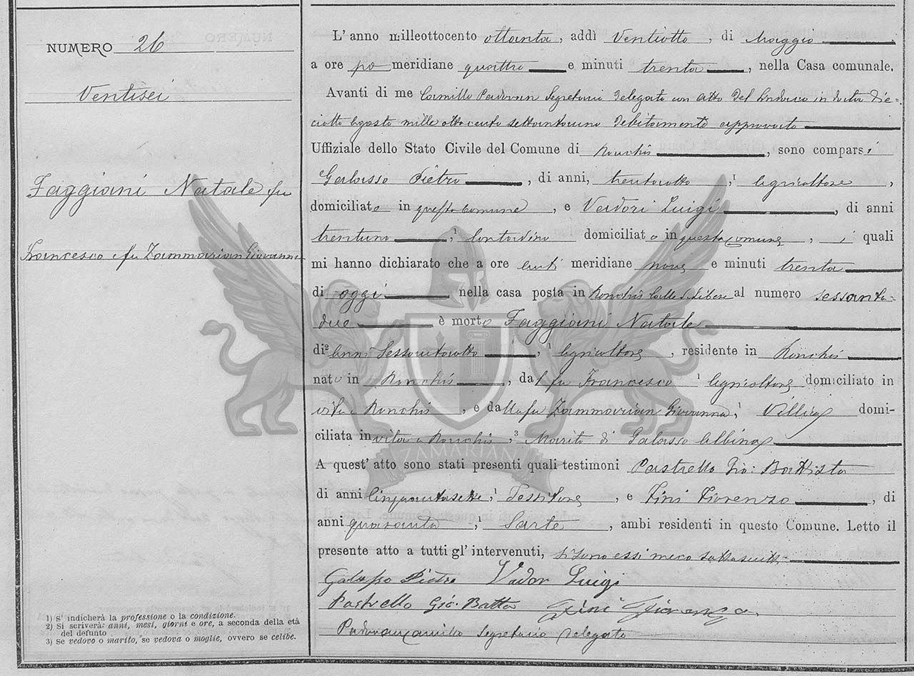 Diante de mim Camillo Padovan secretário delegado com ato do Síndico dezoito de agosto de mil oitocentos e setenta e um devidamente aprovado Oficial do Registro Civil do Município de Ronchis, compareceram Galasso Pietro, de trinta e oito anos, agricultor, domiciliado neste Município, e Vadori Luigi, de trinta e um anos, camponês domiciliado neste município, os quais me declararam que às nove horas e trinta minutos da manhã, de hoje, na casa situada em Ronchis Colle Libere, no número sessenta e dois, faleceu Faggiani Natale, de sessenta e oito anos, agricultor, residente em Ronchis nascido em Ronchis, filho do finado Francesco, agricultor, domiciliado em Ronchis, e da finada Zammarian Giovanna, era camponesa, domiciliada em vida em Ronchis, marido de Galasso Albina.