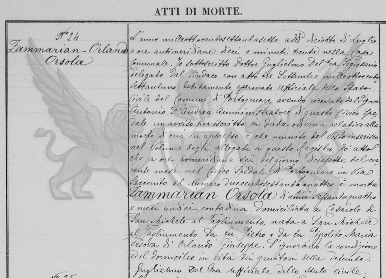Eu subscrito Doutor Guglielmo Del Fra secretário delegado do Síndico com ato três de setembro de mil oitocentos e setenta e um, devidamente aprovado Oficial do Registro Civil do Município de Portogruaro, tendo recebido do Senhor Antonio D’Andrea administrador deste cívico hospital um aviso por inscrito na data ordinária relativo à morte do qual em apresso e que munido do visto insiro no volume dos anexos deste registro, dou ato que às seis horas da tarde do dia dezessete do corrente mês no cívico hospital de Portogruaro na via Sacconito ao número duzentos e setenta e quatro faleceu Zammarian Orsola de sessenta e quatro anos e onze meses, camponesa, domiciliada em Cesarolo de San Michele al Tagliamento, nascida em San Michele al Tagliamento do finado Pietro e da finada Pizzolitto Maria viúva de Orlando Giuseppe.