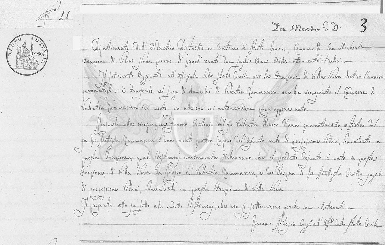 Presentes ao reconhecimento estavam Valentin Macor de quarenta e oito anos e Pietro filho de do finado Gio: Battista Zammarian de vinte e quatro anos, ambos de profissão camponeses, domiciliados nesta Fração, quais testemunhas em conjunto declararam que o supracitado falecido nasceu nesta Fração de Villa Nova de Biasio filho de Valentin Zammarian e de Pasqua filha de Gio: Battista Cicutto da mesma forma camponeses, domiciliados nesta Fração de Villa Nova.