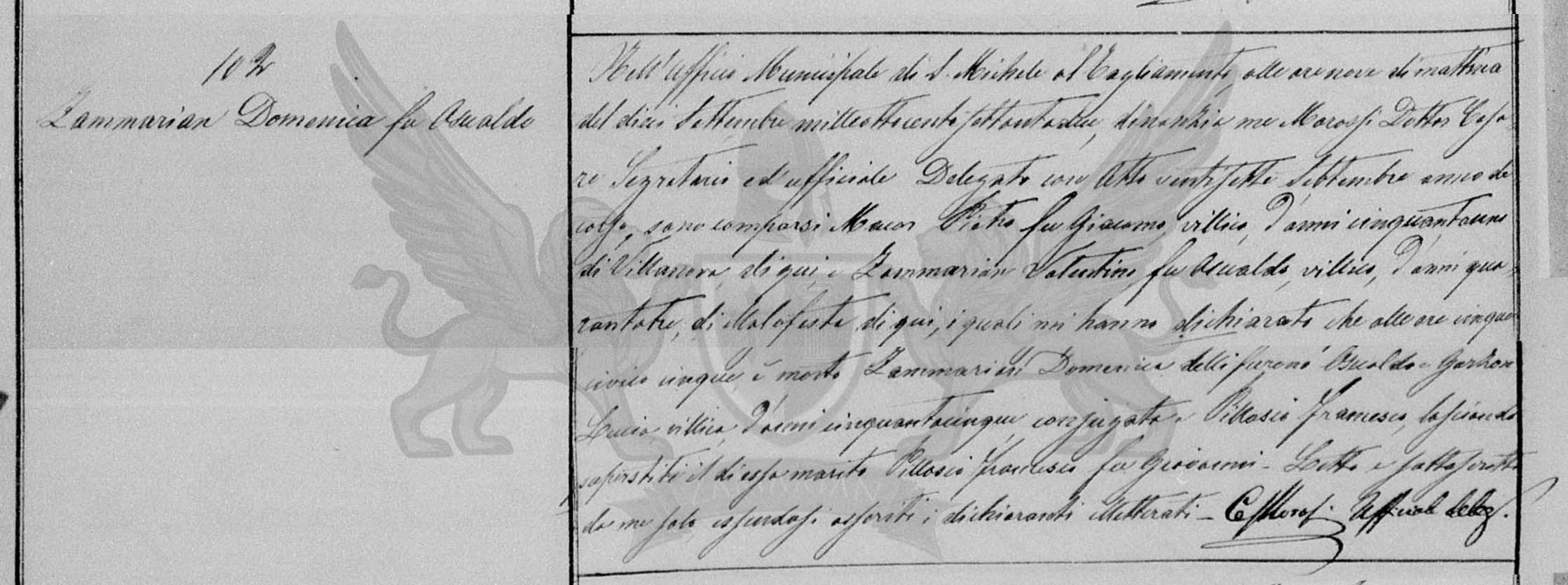 No Ofício Municipal de San Michele al Tagliamento pela manhã do dia dez de Setembro de mil oitocentos e setenta e dois, diante de mim Marcosi Doutor Cesare Secretário e oficial Delegado com ato vinte e sete de setembro do ano decorrido, compareceram Macor Pietro filho do falecido Giacomo, camponês, do cinquenta e um anos de Villanova daqui, e Zammarian Valentino, filho do falecido Osvaldo, camponês, de quarenta e três anos, de Malafesta daqui, os quais declaram que às pós-meridiana cinco horas de ontem nove corrente, na casa situada em Villanova daqui ao número cívico cinco, faleceu Zammarian Domenica filha dos falecidos Osvaldo e Garzon Lucia, camponesa, de cinquenta e cinco anos, conjugada com Pilosio Francesco, braçal sobrevivente o desta marido Pilosio Francesco filho do falecido Giovanni. Lido e subscrito apenas por mim sendo os demais declarantes iletrados.