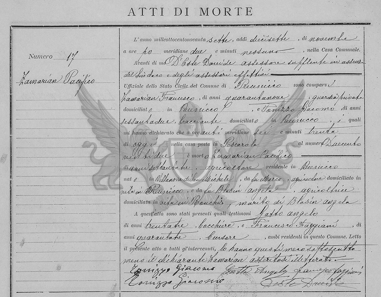 Diante de mim D’Este Davide assessor suplente em ausência do Síndico e dos assessores efetivos Oficial do Registro Civil do Município de Precenicco, compareceram Zamarian Francesco, de quarenta e nove anos, guarda privado, domiciliado em Precenicco, e Tonizzo Giacomo, de sessenta e dois anos, lavrador domiciliado em Precenicco, os quais me declararam que às seis horas da manhã, de hoje, na casa situada em Pescarola, ao número duzentos e vinte e dois, faleceu Zamarian Pacifico, de setenta e três anos, agricultor, residente em Precenicco, nascido em Villanova de San Michele, filho do finado Marco, agricultor, domiciliado em vida em Precenicco, e da finada Blasin Angela, agricultora, domiciliada em vida em Ronchis, marido de Biasin Angela Blasin.