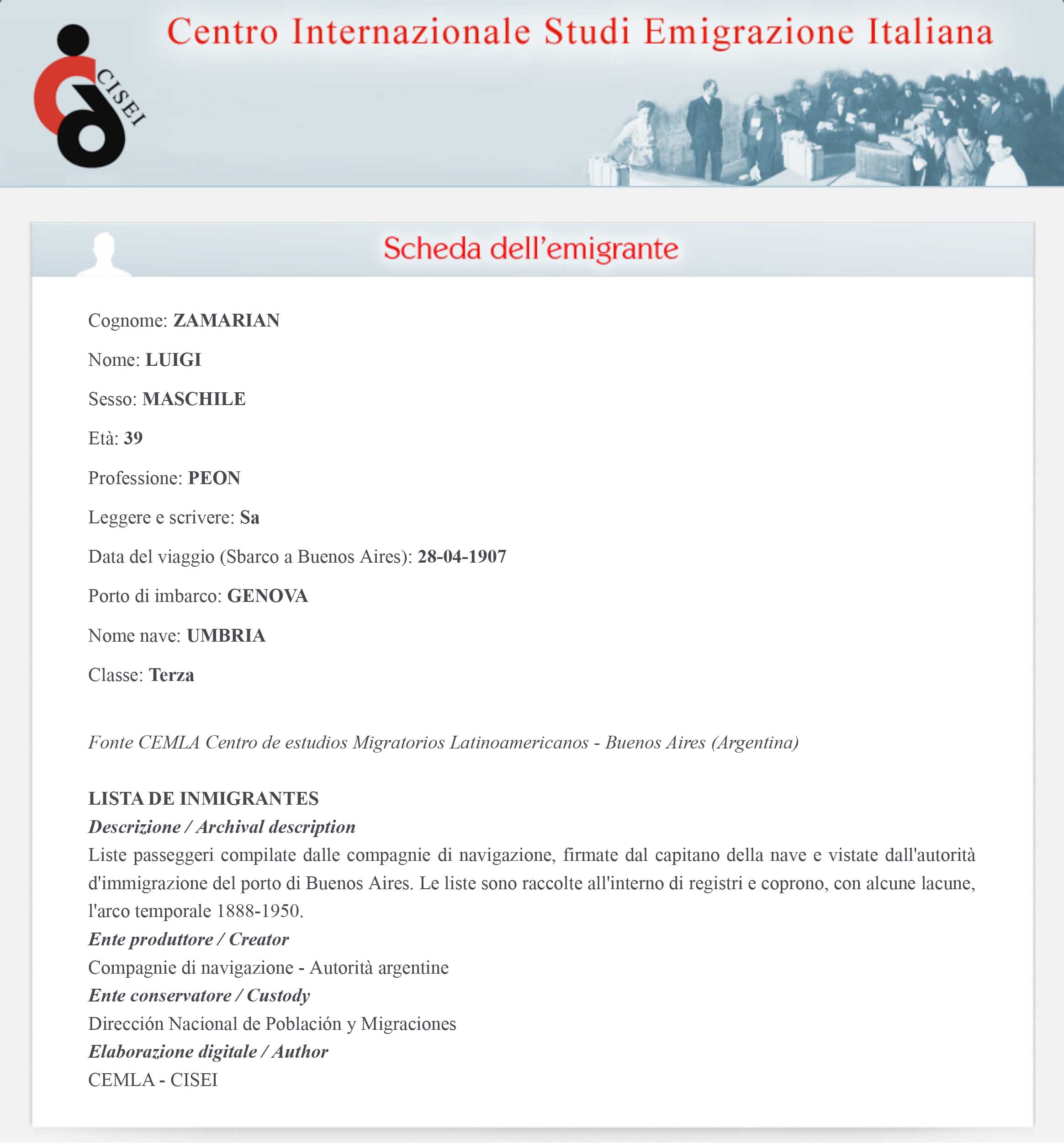 Registro de Imigração de Luigi Zamarian para Buenos Aires, Argentina