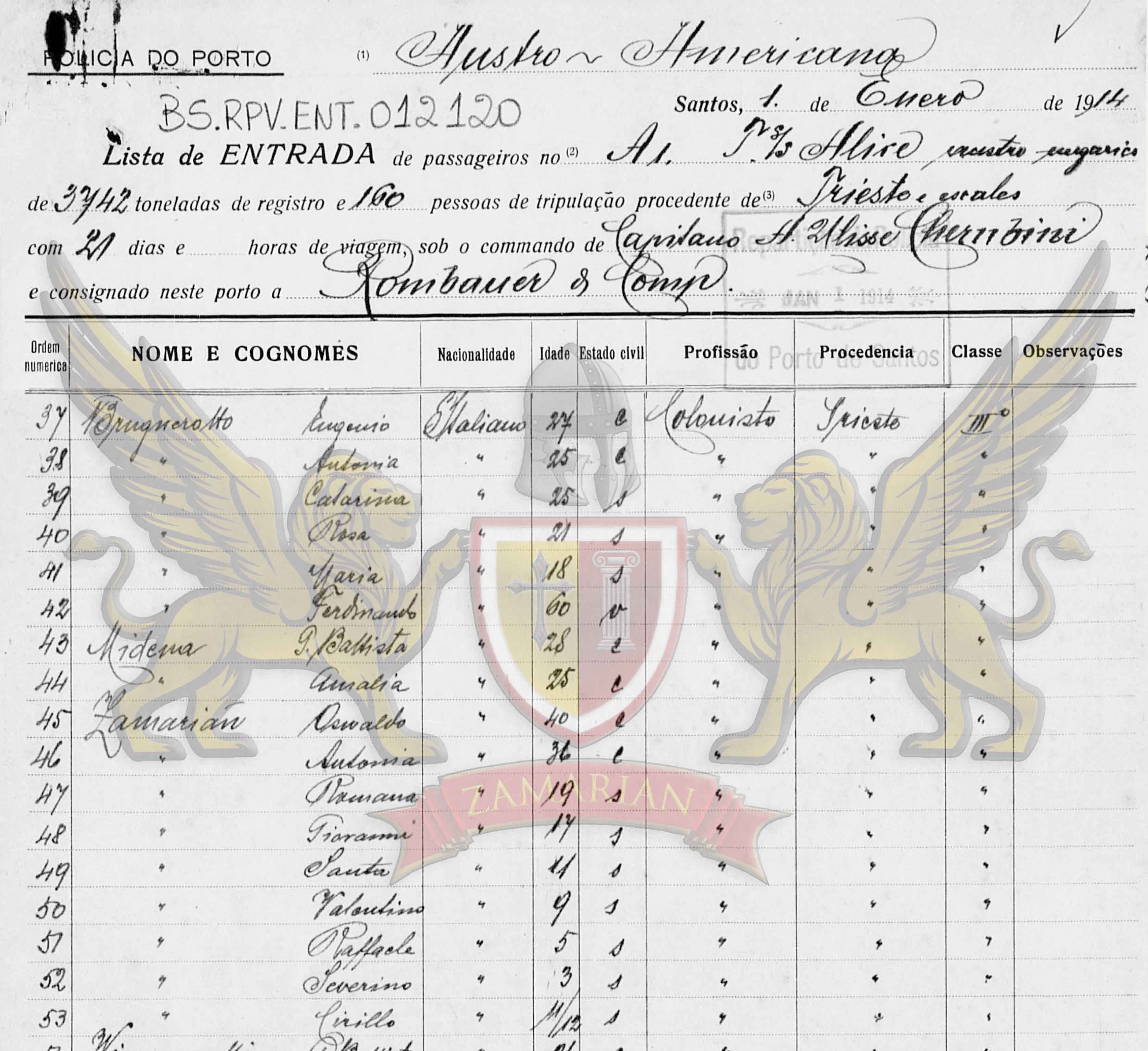 Lista de passageiros com o nome de Osvaldo Zamarian e família do navio Alice