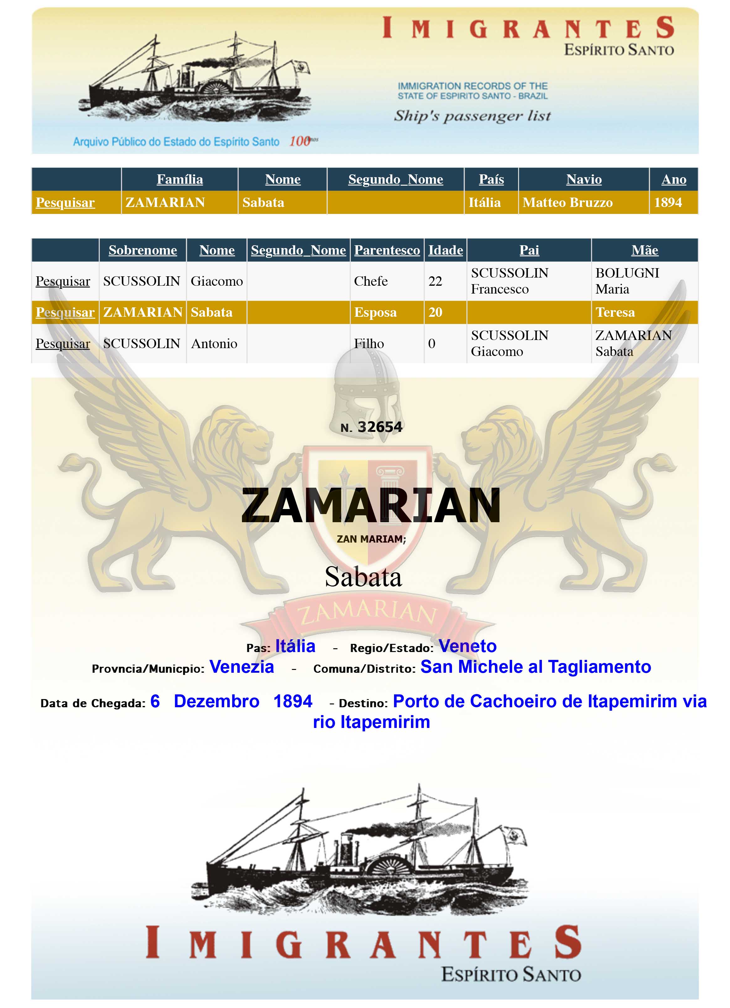 Família ZAMARIAN | nome Sabata | País Itália | Navio Matteo Bruzzo | Ano 1894