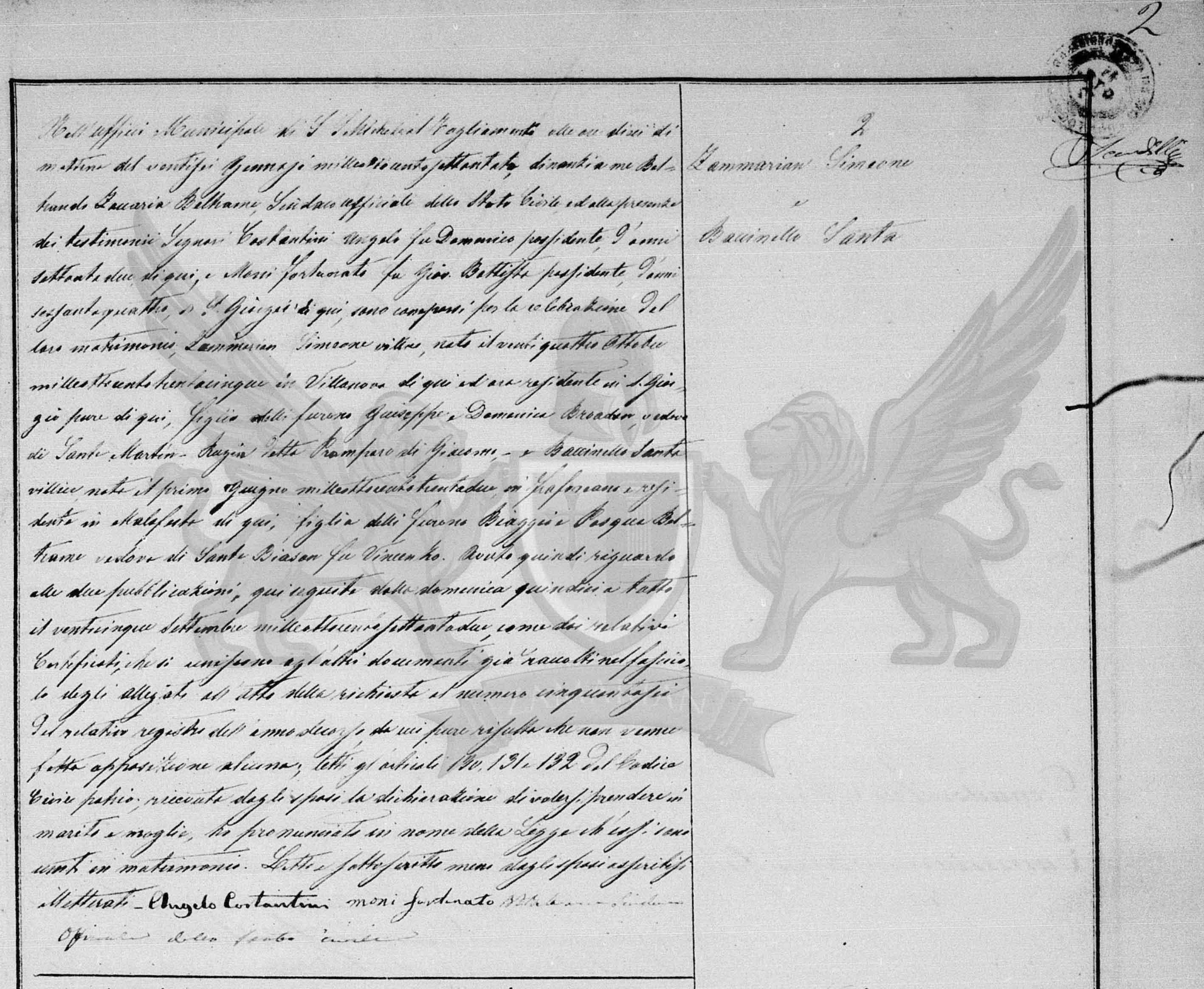 No ofício municipal de S. Michele al Tagliamento às dez horas da manhã do dia vinte e seis de janeiro de mil oitocentos e setenta e dois, diante de mim Beltrando Zaccaria Beltrame Síndico oficial do Registro Civil recebi do Oficial do Registro Civil e à presença das testemunhas senhores Costantini Angelo filho do finado Domenico, proprietário de terras de sessenta e dois anos e Mossi Fortunato filho do finado Gio Battista, proprietário de terras de sessenta e quatro anos, de S. Giorgio daqui, compareceram para a celebração de seu matrimônio, Zamarian Simeone camponês, nascido no dia vinte e quatro de outubro de mil oitocentos e trinta e cinco em Villanova daqui e agora residente em S. Giorgio daqui, filho dos finados Giuseppe e Domenica Broadan, viúvo de Santa Martin - Rugiera conhecida como Promparo filha de Giacomo,- e Baccinello Santa camponesa, nascida no dia primeiro de junho de mil oitocentos e trinta e dois em Fraforeano e residente em Malafesta daqui, filha dos finados Biaggio e Pasqua Beltrame viúva de Sante Biason filho do finado Vincenzo.