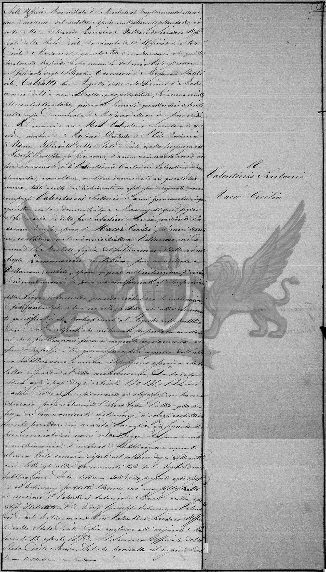 No ofício municipal de S. Michele al Tagliamento às nove horas da manhã do dia vinte e três de Abril de mil oitocentos e setenta e três, eu subscrito Beltrando Zaccaria Síndico oficial do Registro Civil recebi do Oficial do Registro Civil de Morsano o seguinte Ato de matrimônio e aqui literalmente transcrito munido do meu visto se coloca no fascículo dos anexos. Município de Morsano Registro Civil. Extraído dos Registros das celebrações de Matrimônio do ano de mil oitocentos e setenta e três, ano de mil oitocentos e setenta e três, dia de segunda-feira quatorze de abril na casa Municipal de Morsano às duas horas da tarde. Diante de mim Mio Valentino Síndico deste Município de Morsano Distrito de S. Vito Província de Udine, Oficial do Registro Civil e da presença de Ridolfi Giuseppe filho do finado Giovanni, de cinquenta e nove anos, cursor Municipal e de Valentinis Carlo filho do finado Valentino de quarenta anos, agricultor, ambos domiciliados neste Município, testemunhas escolhidas pelos declarantes em apresso designados compareceram Valentinis Antonio de quarenta e cinco anos, agricultor, nascido e domiciliado em Masson daqui filho do finado Carlo e da finada Sabbadini Maria, viúvo de Padovani Teresa, nubente, e Macor Cecilia, de trinta e dois anos, camponesa, nascida e domiciliada em Villanova no Município de S. Michele, filha do finado Giacomo e da vivente Angela Zammarian, camponesa, também domiciliada em Villanova, solteira, nubente os quais na intenção de unir-se em matrimônio já estão informados da Lei, produzindo quando requerido as publicações autênticas da intenção, os outros documentos qualificados que encontram=se unidos ao Registro das Publicações e nenhuma oposição tendo ocorrida no que diz respeito ao matrimônio. Depois de dada a leitura aos nubentes dos artigos 130,131 e 132 do Código Civil e sucessivamente os mesmos nubentes se declararam pessoalmente um após o outro à presença das supra identificadas testemunhas de quererem respectivamente tomarem-se por marido e mulher e em seguida os declarei em nome da Lei. Os certificados das publicações munidas do meu visto foram inseridas no volume dos anexos com todos os outros documentos do registro das publicações. Dada leitura do Ato prescrito aos nubentes e às testemunhas pré citadas comigo subscreveram à exceção de Valentinis Antonio e Macor Cecilia declarando-se iletrados.